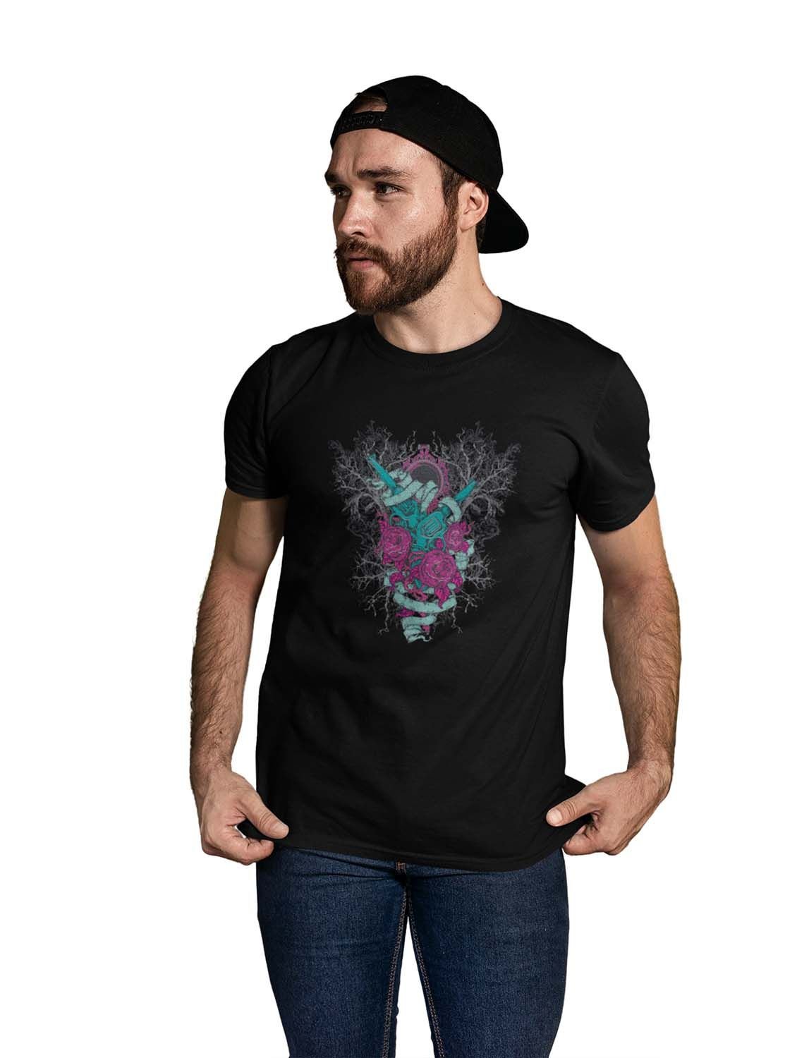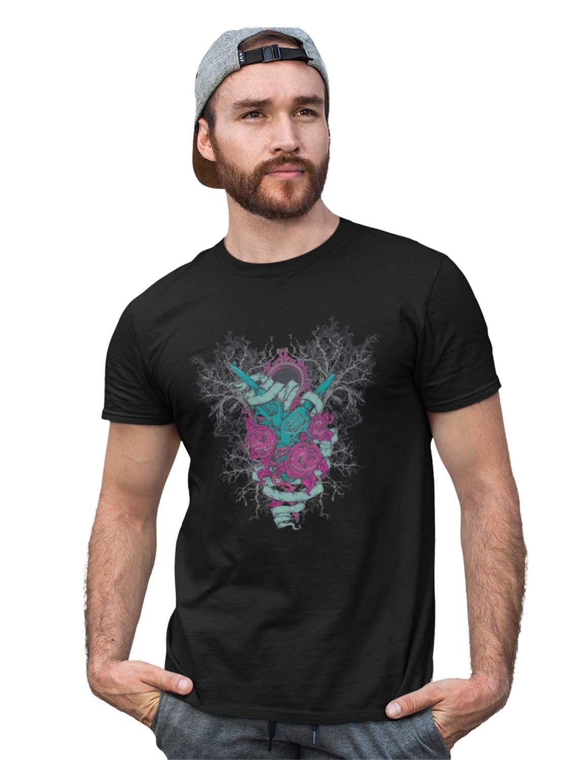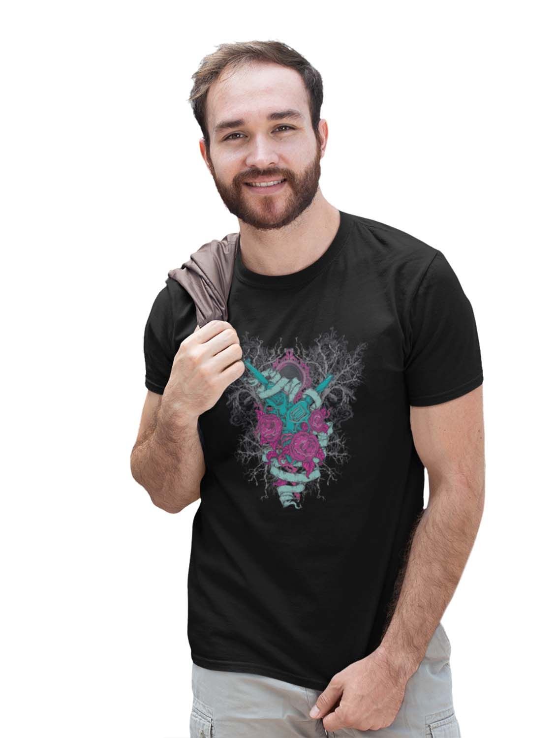 The Shooter And Roses Black Round Neck Cotton Half Sleeved T-Shirt with Printed Graphics