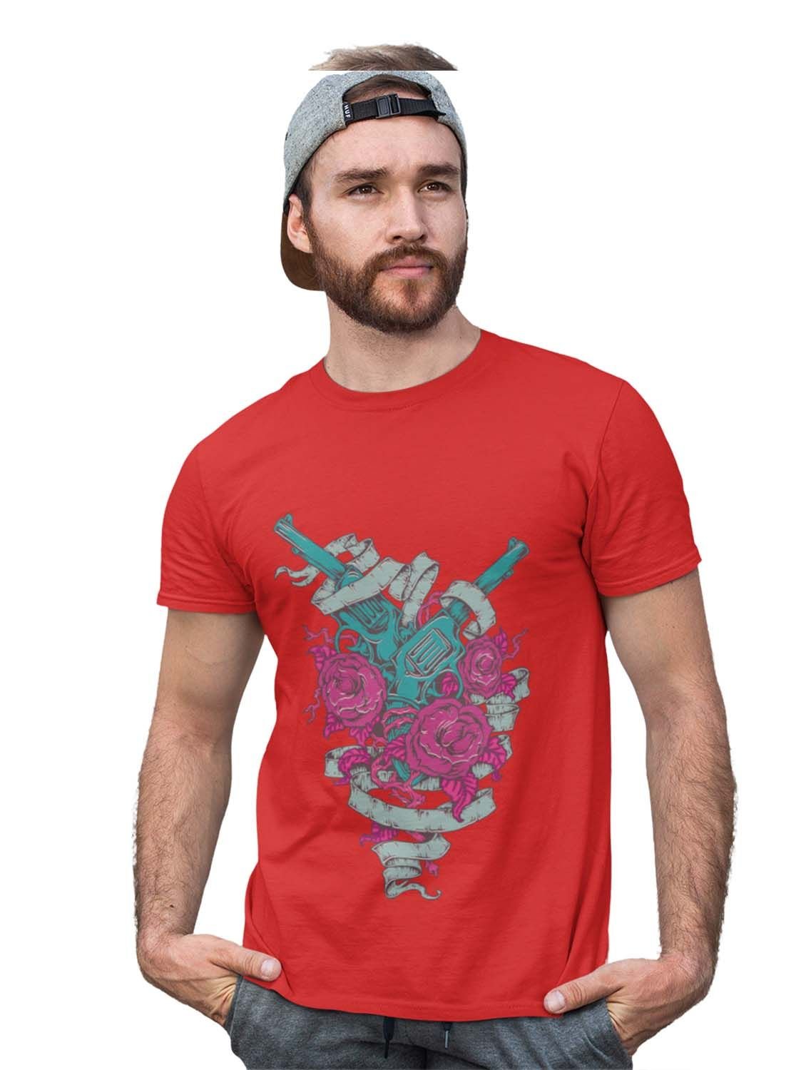 The Shooter And Roses Red Round Neck Cotton Half Sleeved T-Shirt with Printed Graphics