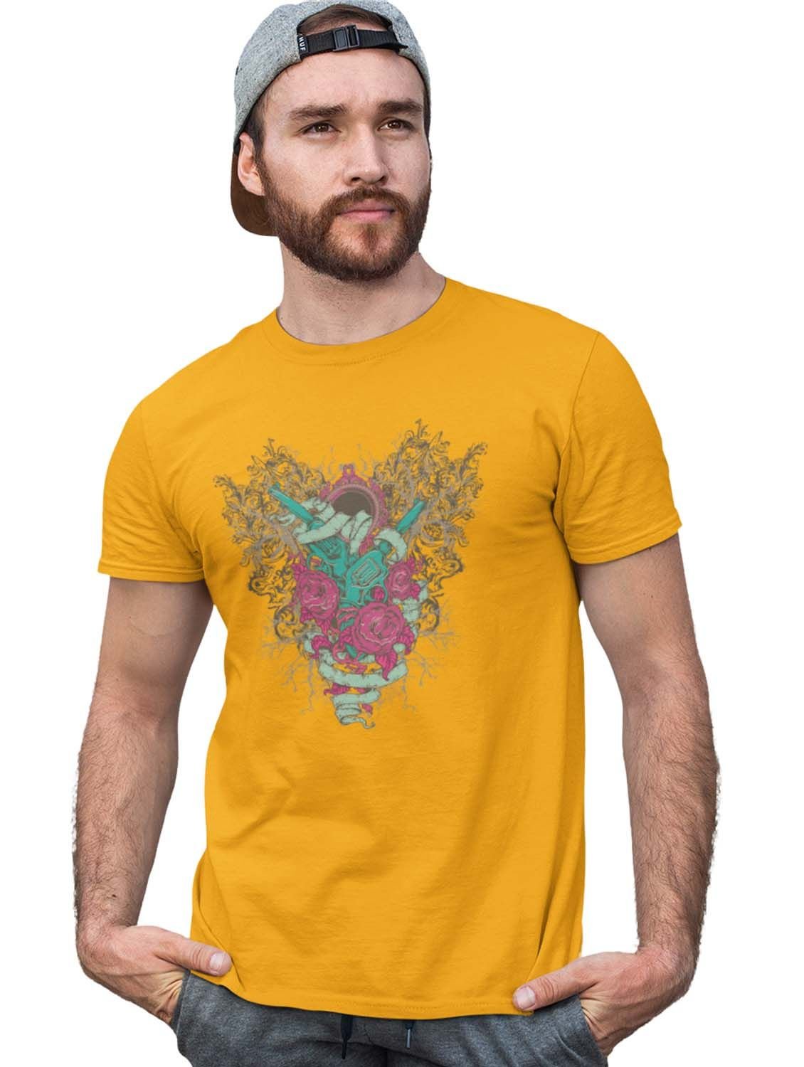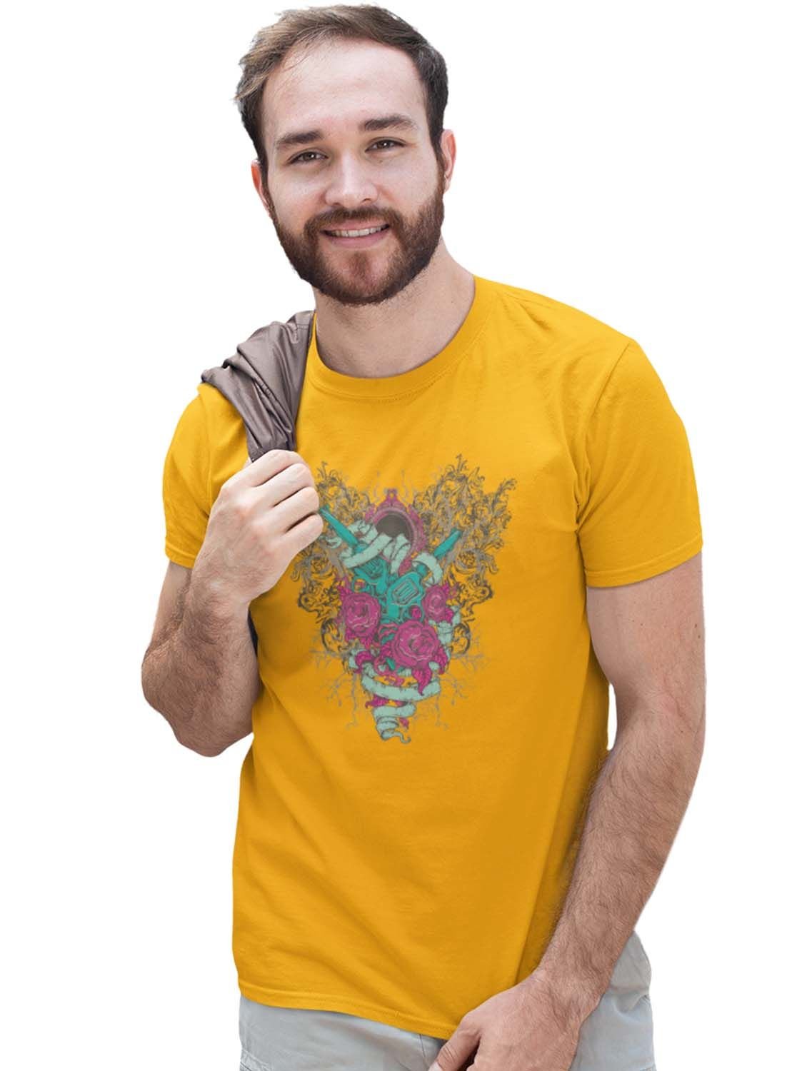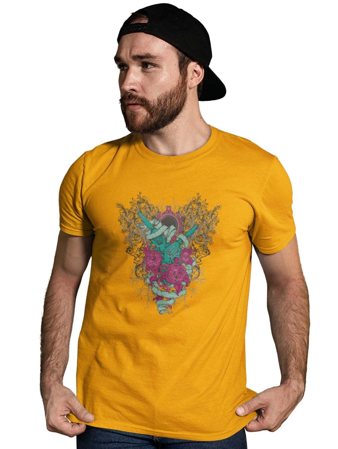 The Shooter And Roses Yellow Round Neck Cotton Half Sleeved T-Shirt with Printed Graphics