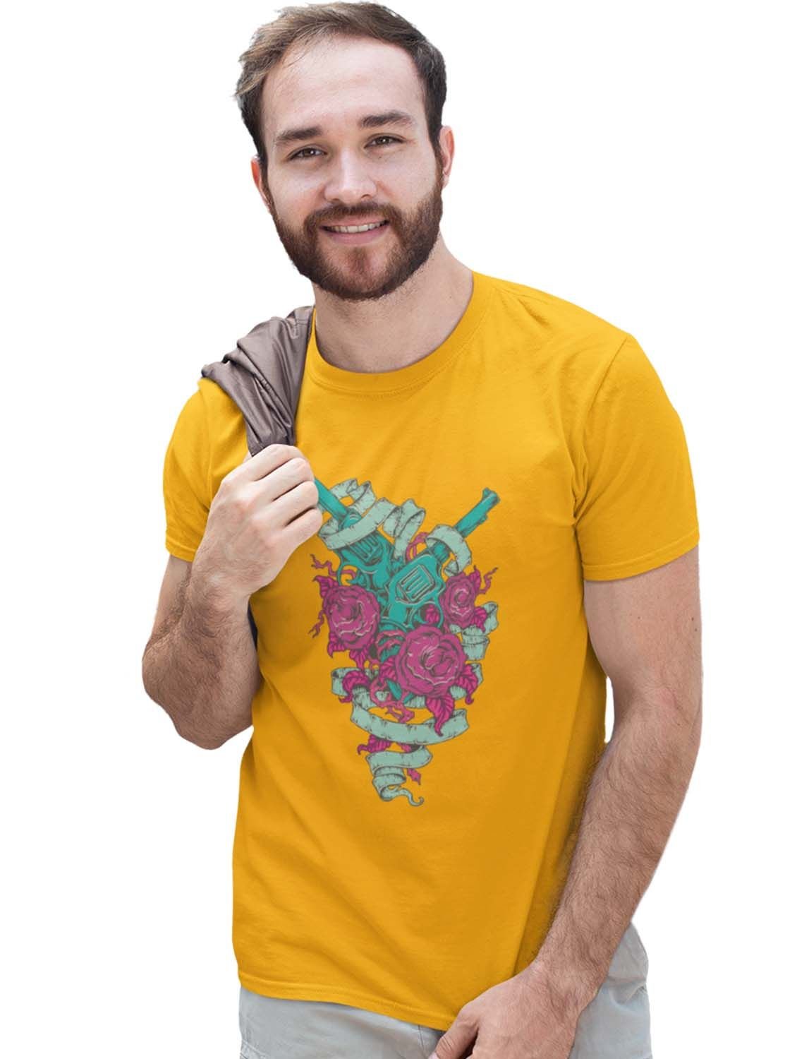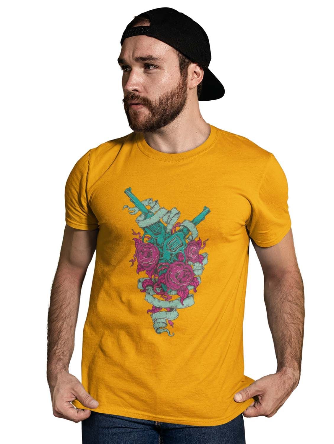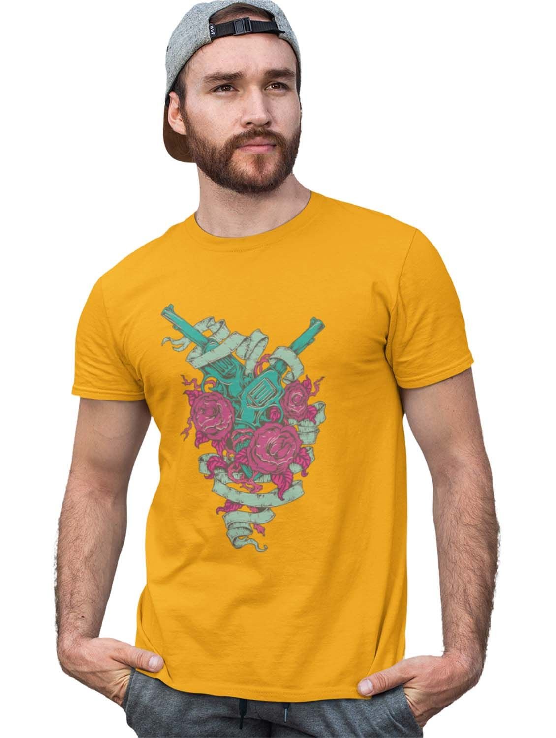 Rods And Roses Yellow Round Neck Cotton Half Sleeved T-Shirt with Printed Graphics