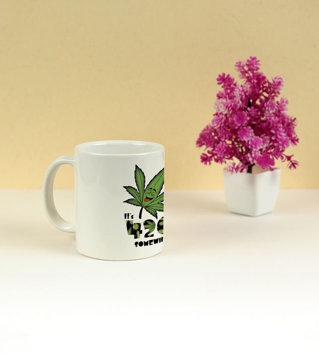 Start your day with a burst of vibrant energy! This printed coffee mug features a psychedelic leaf artwork surrounded by colorful flame-like patterns