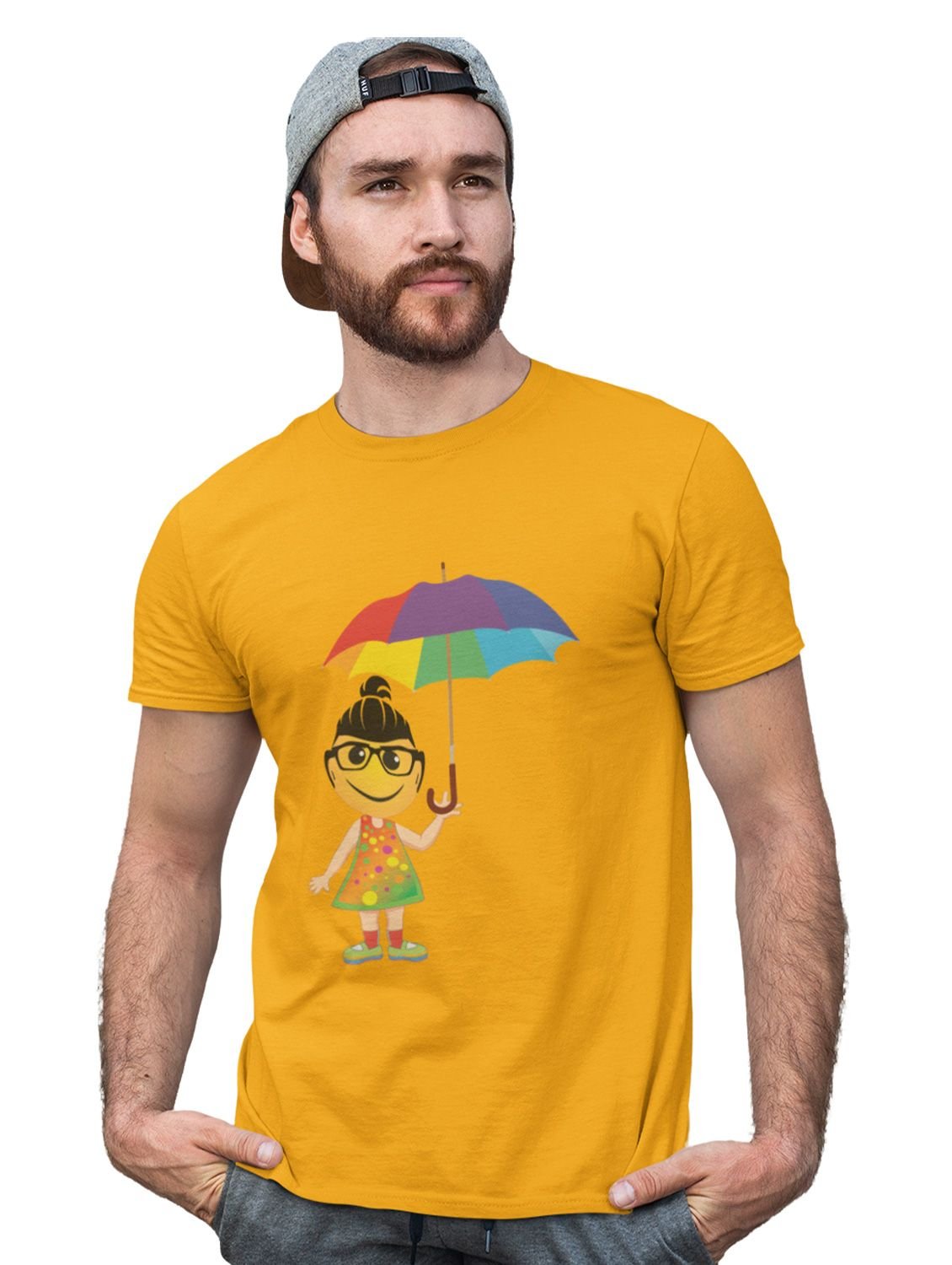 A Young Emoji Girl with Umbrella Printed T-shirt (Yellow) - Clothes for Emoji Lovers - Suitable for Fun Events- Foremost Gifting Material for Your Friends and Close Ones
