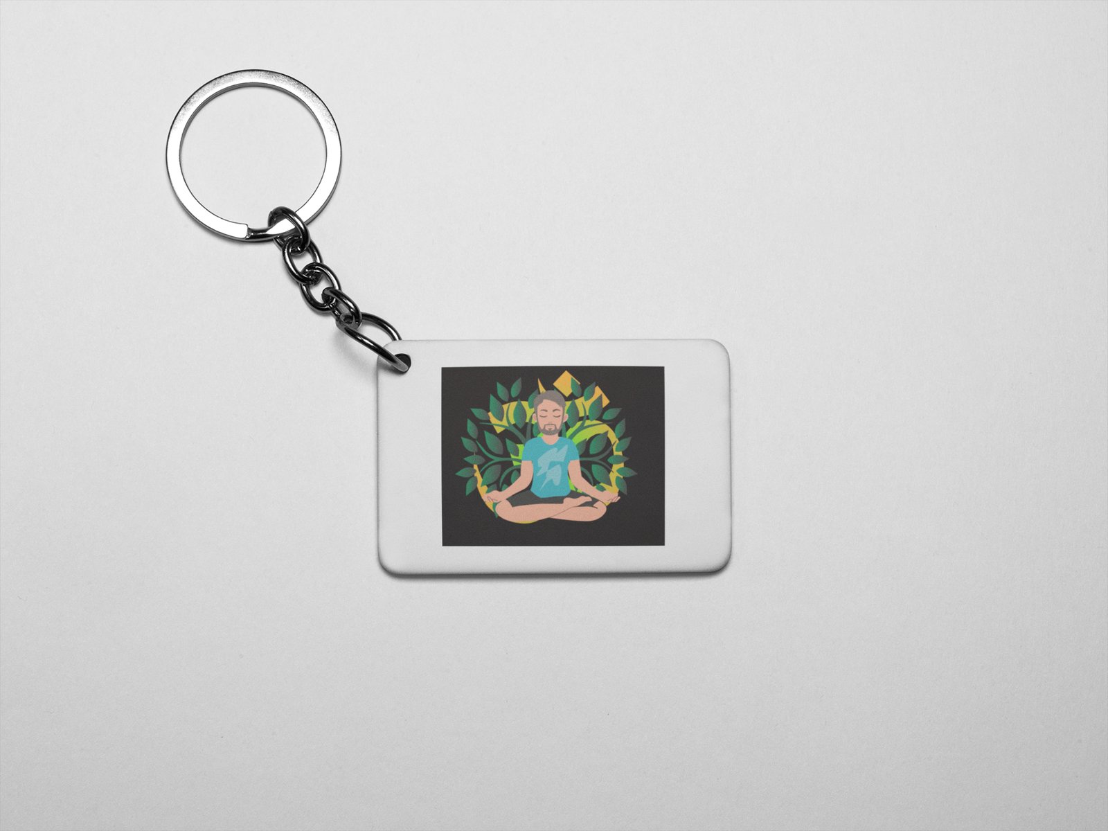 A Young Man - Cartoon - Sitting In Front Of Om Symbol, (BG Green And Yellow)- Printed Acrylic Keychains(Pack Of 2)