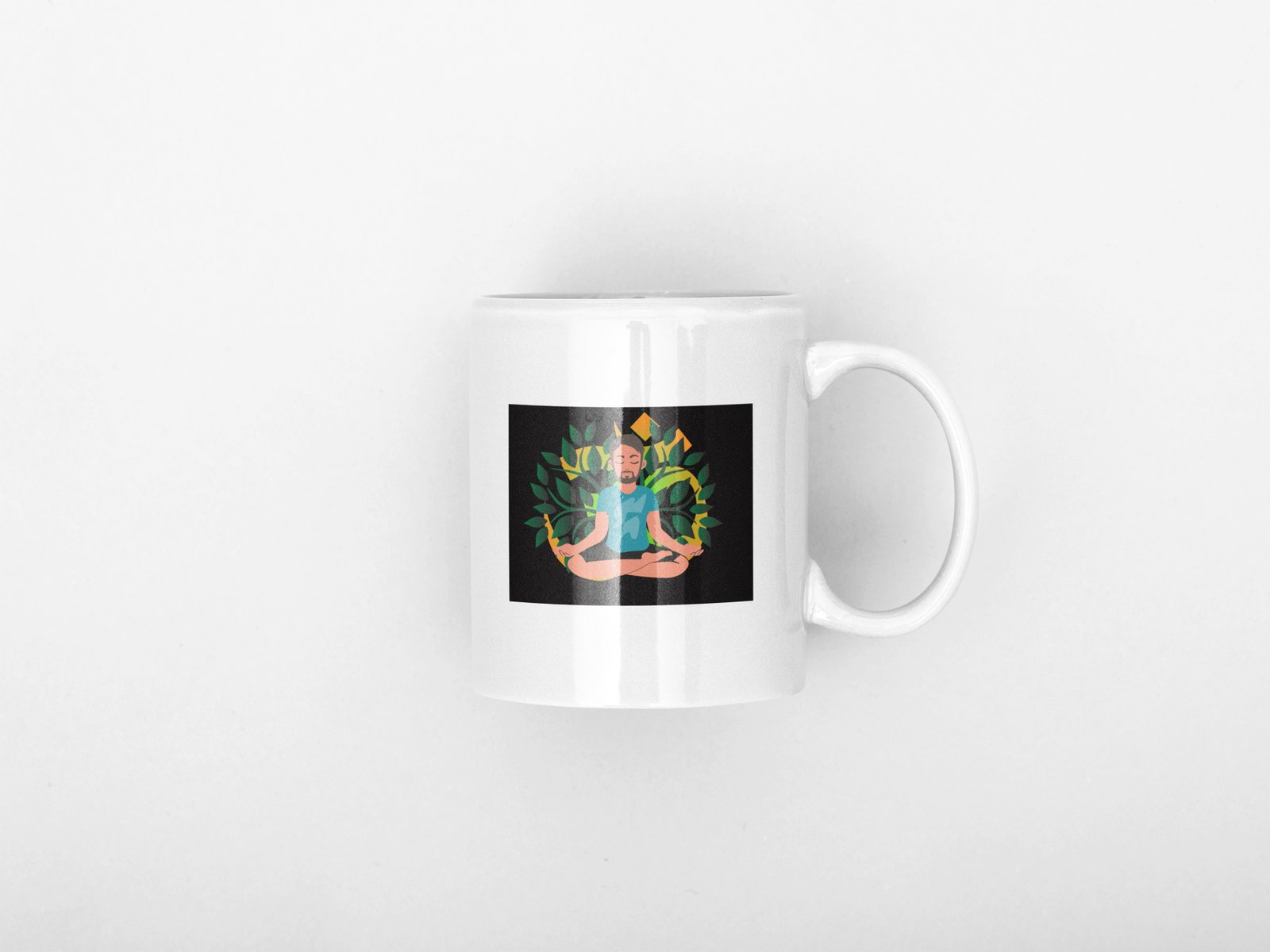 A Young Man - Cartoon - Sitting In Front Of Om Symbol, (BG Green And Yellow) - Printed Coffee Mugs For Yoga Lovers