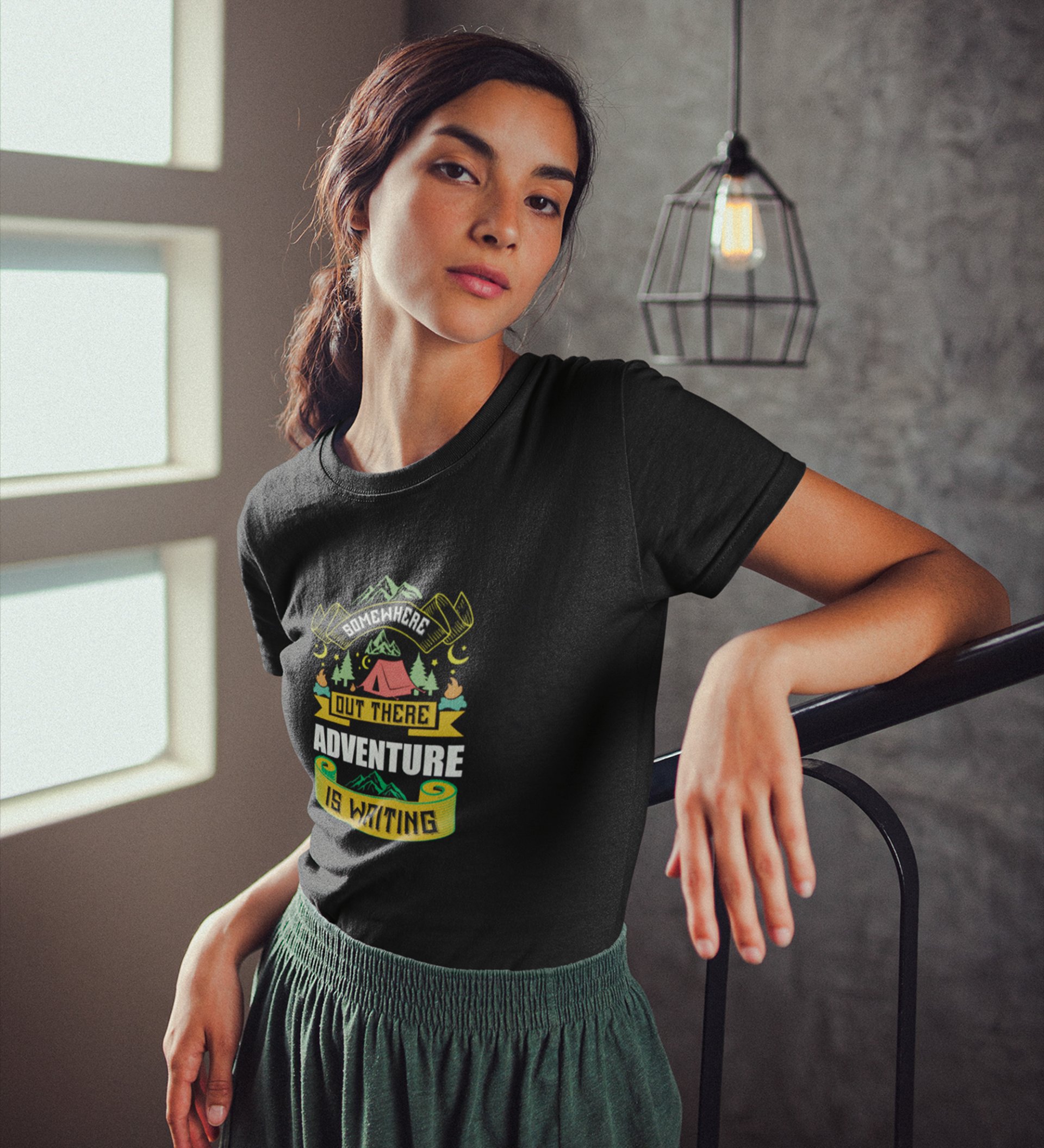 HopOfferAdventure Is Waiting Black Round Neck Cotton Half Sleeved Women's T-Shirt with Printed Graphics