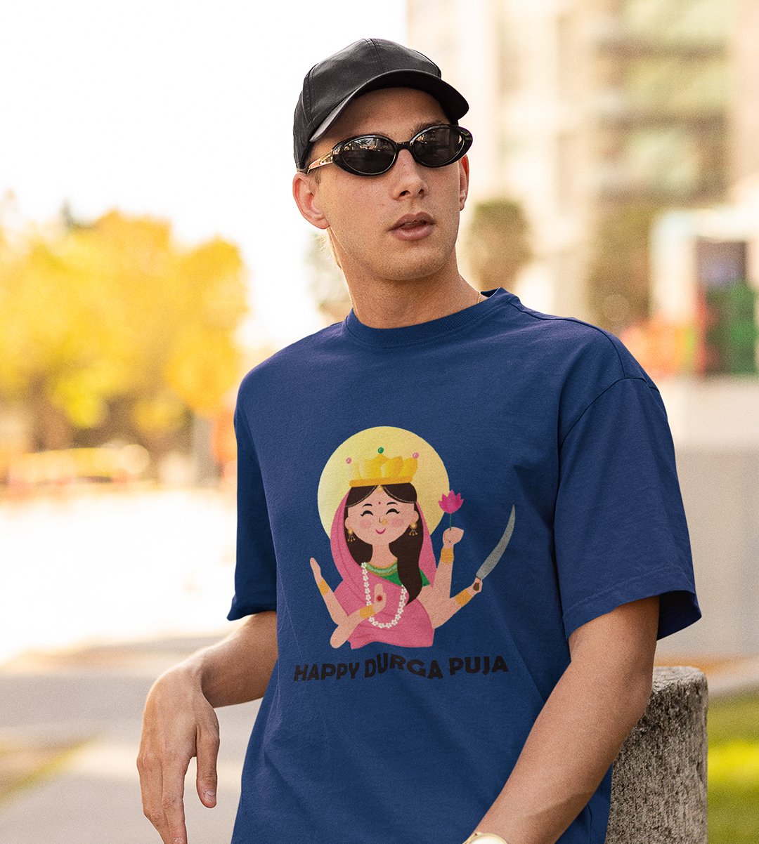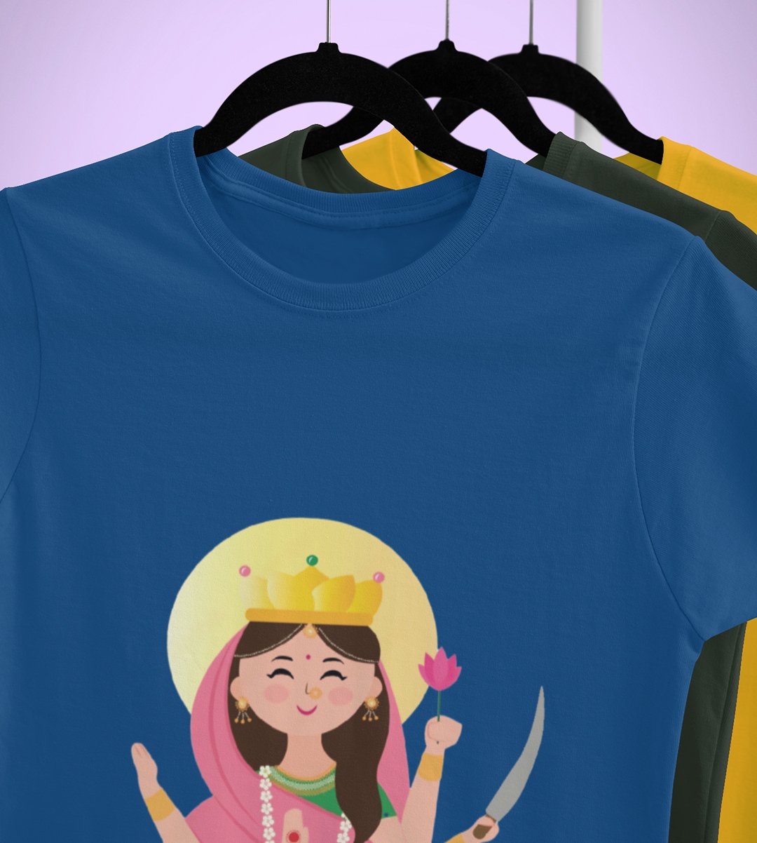 Animated durga maa (Crown) printed unisex adults round neck cotton half-sleeve blue tshirt specially for Navratri festival/ Durga puja