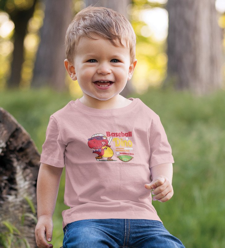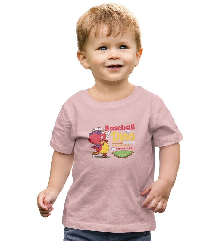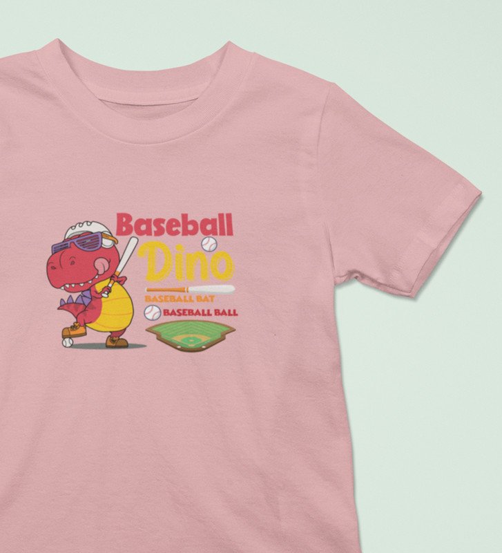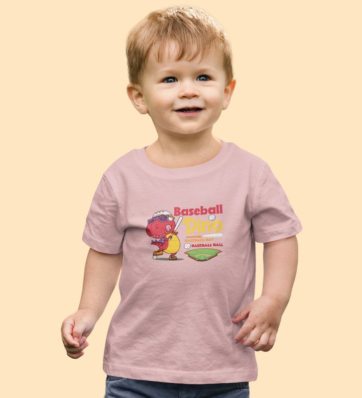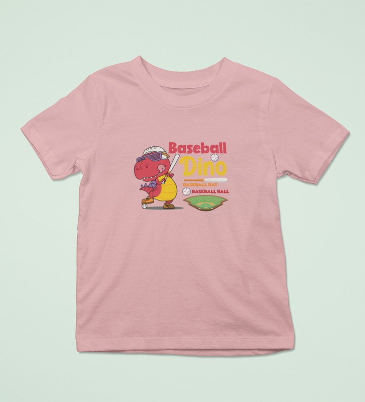 Baseballer Dino, Boys Round Neck Blended Cotton Tshirt (baby pink)