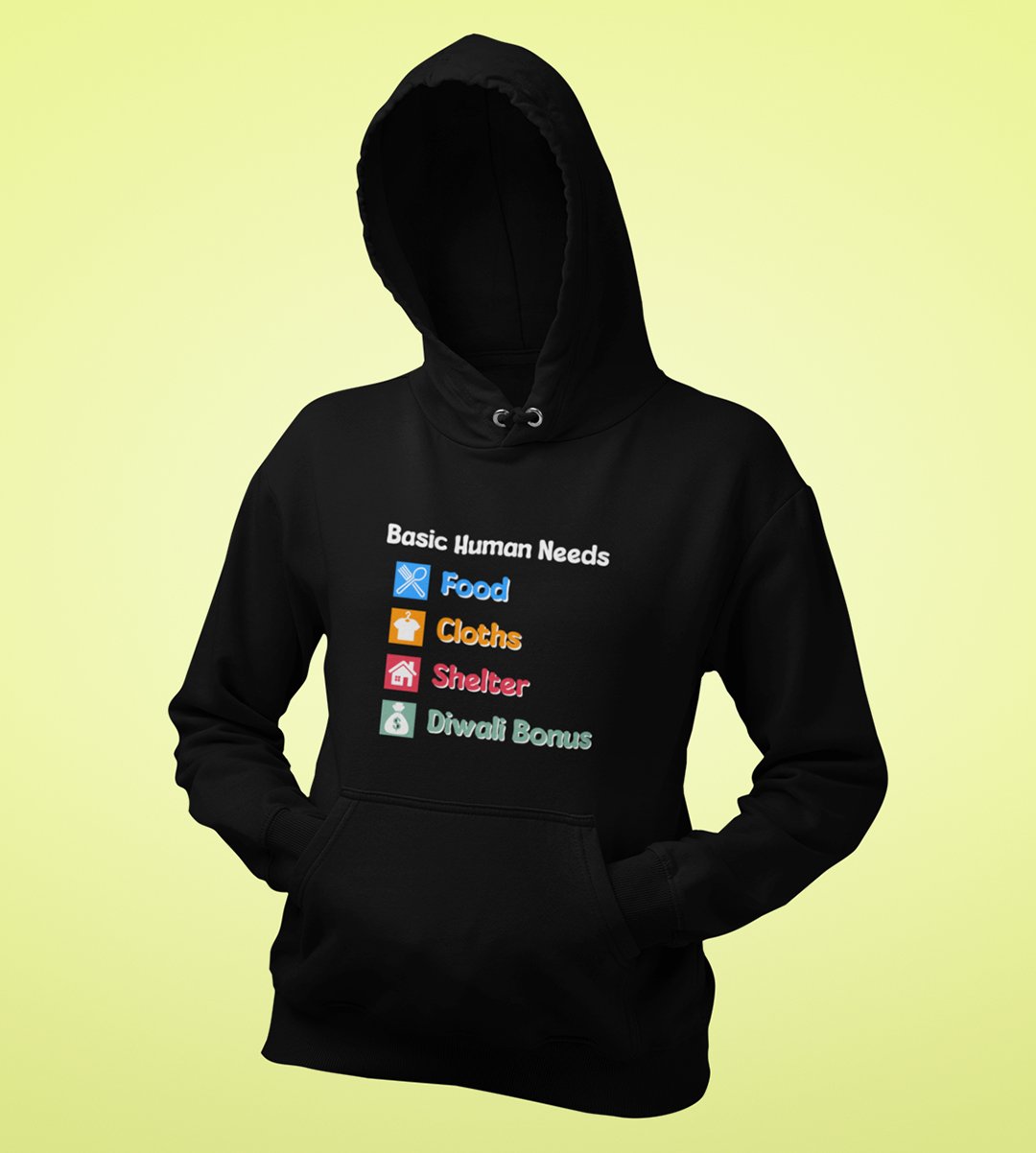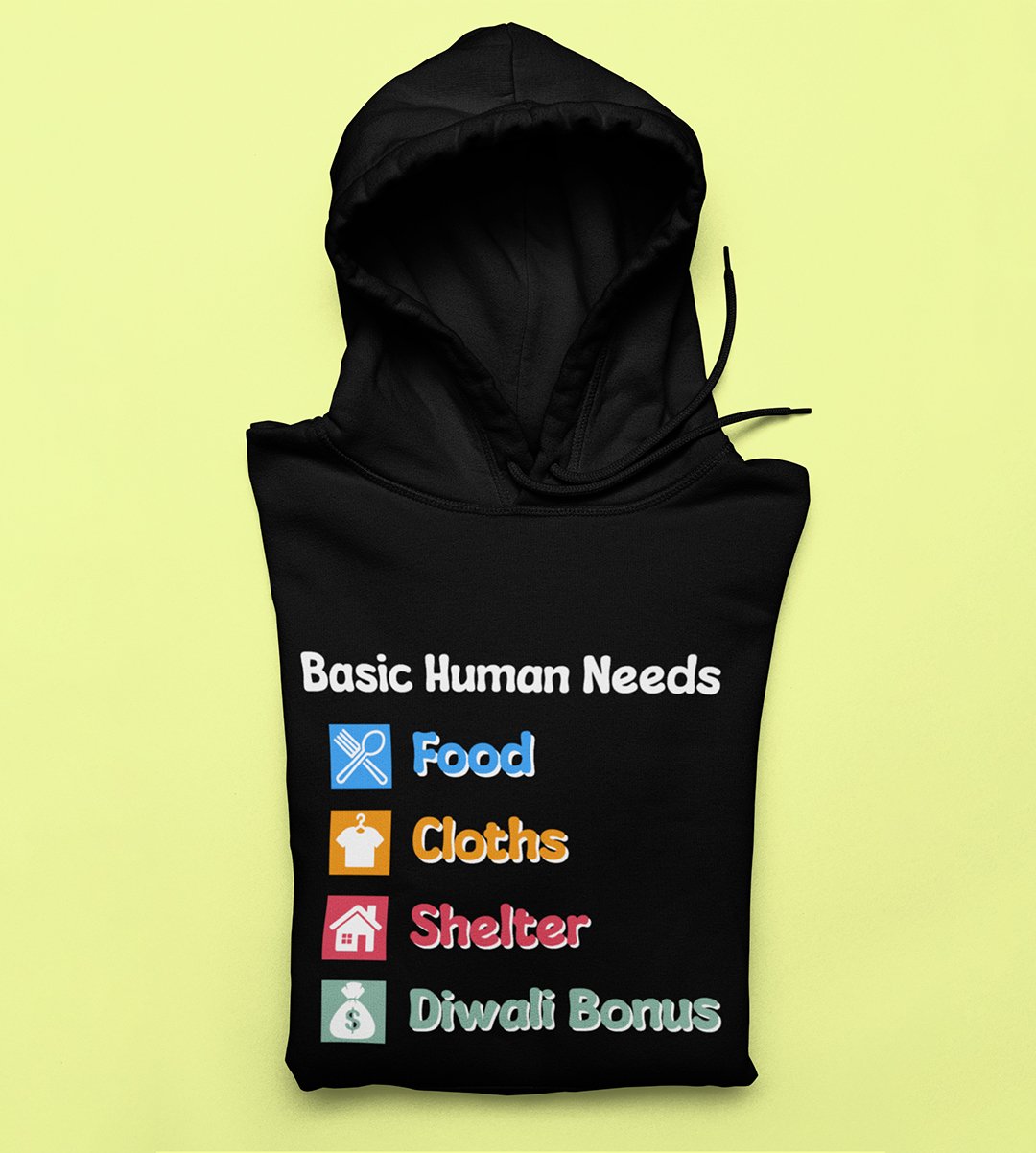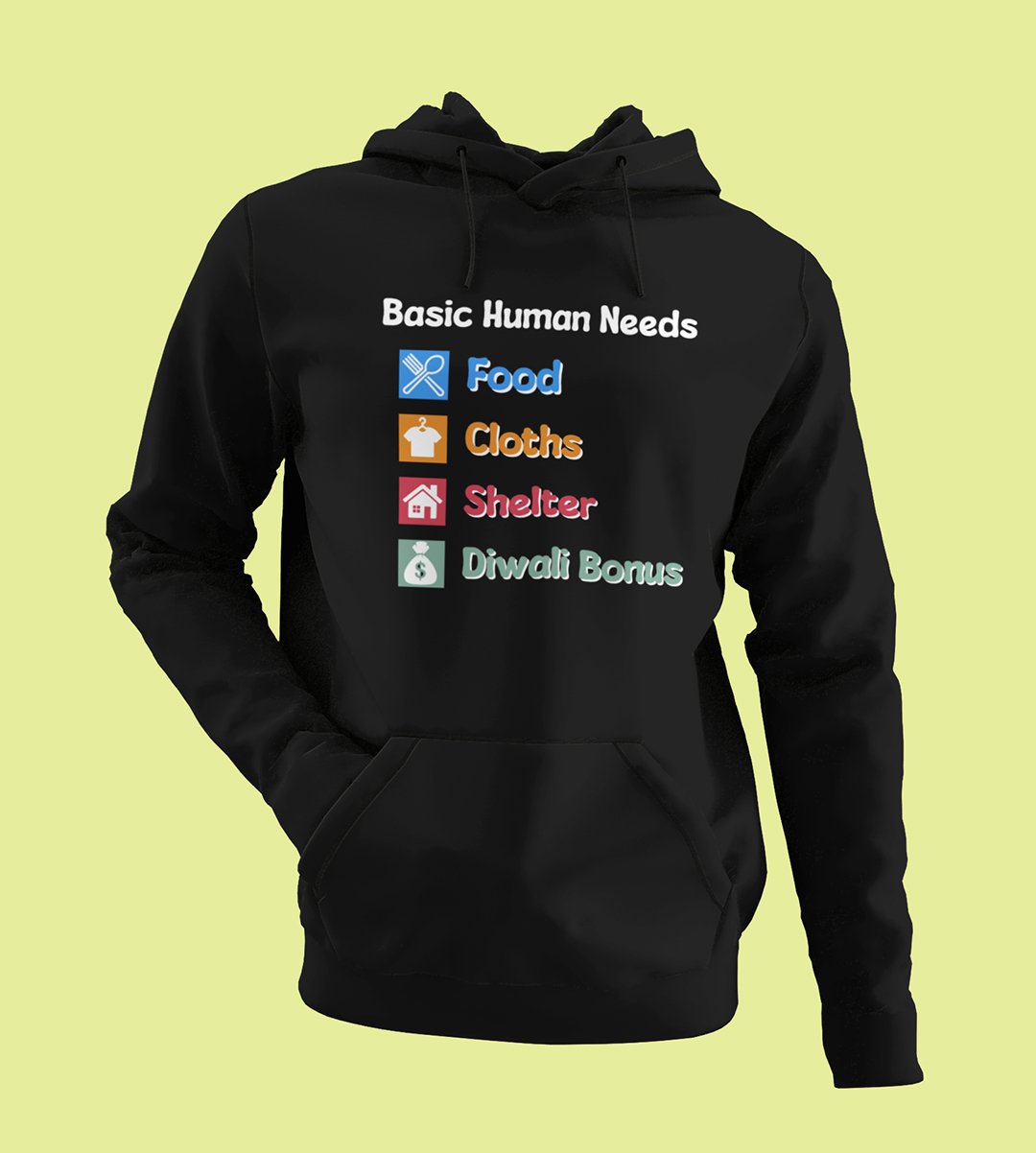 Celebrate the season of abundance with our "Diwali Bonus Delight" black Hoodie . This humorous design humorously adds "Diwali Bonus" to the list of essentials - Food, Clothes, Shelter, and Diwali Bonus. Join the laughter and revel in the anticipation of the coveted yearly tradition as every sip becomes a bonus in itself.
