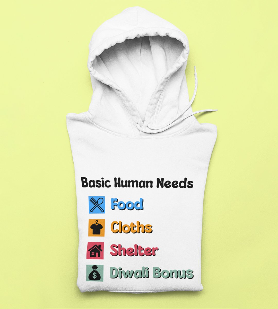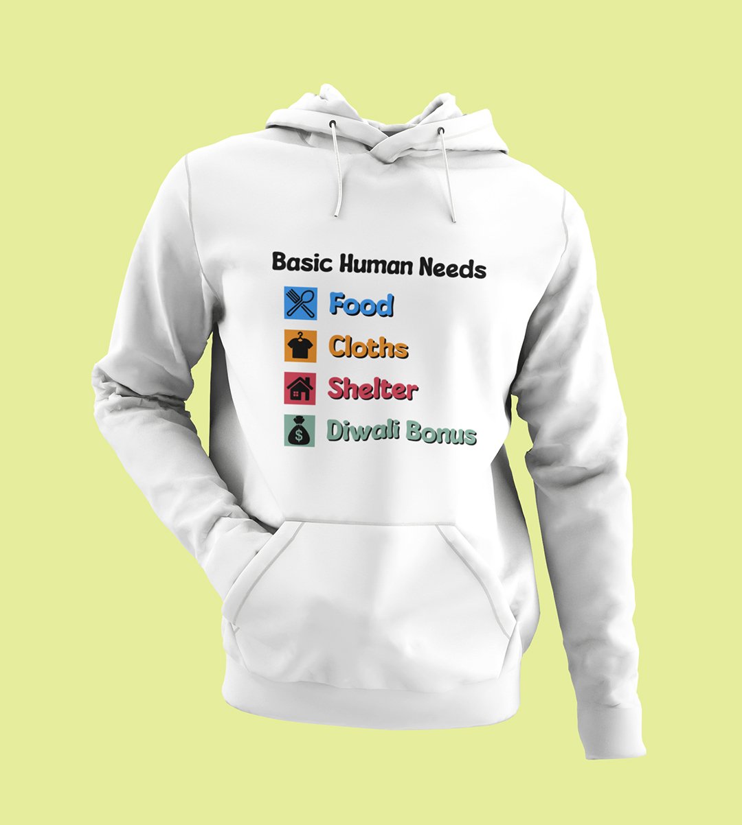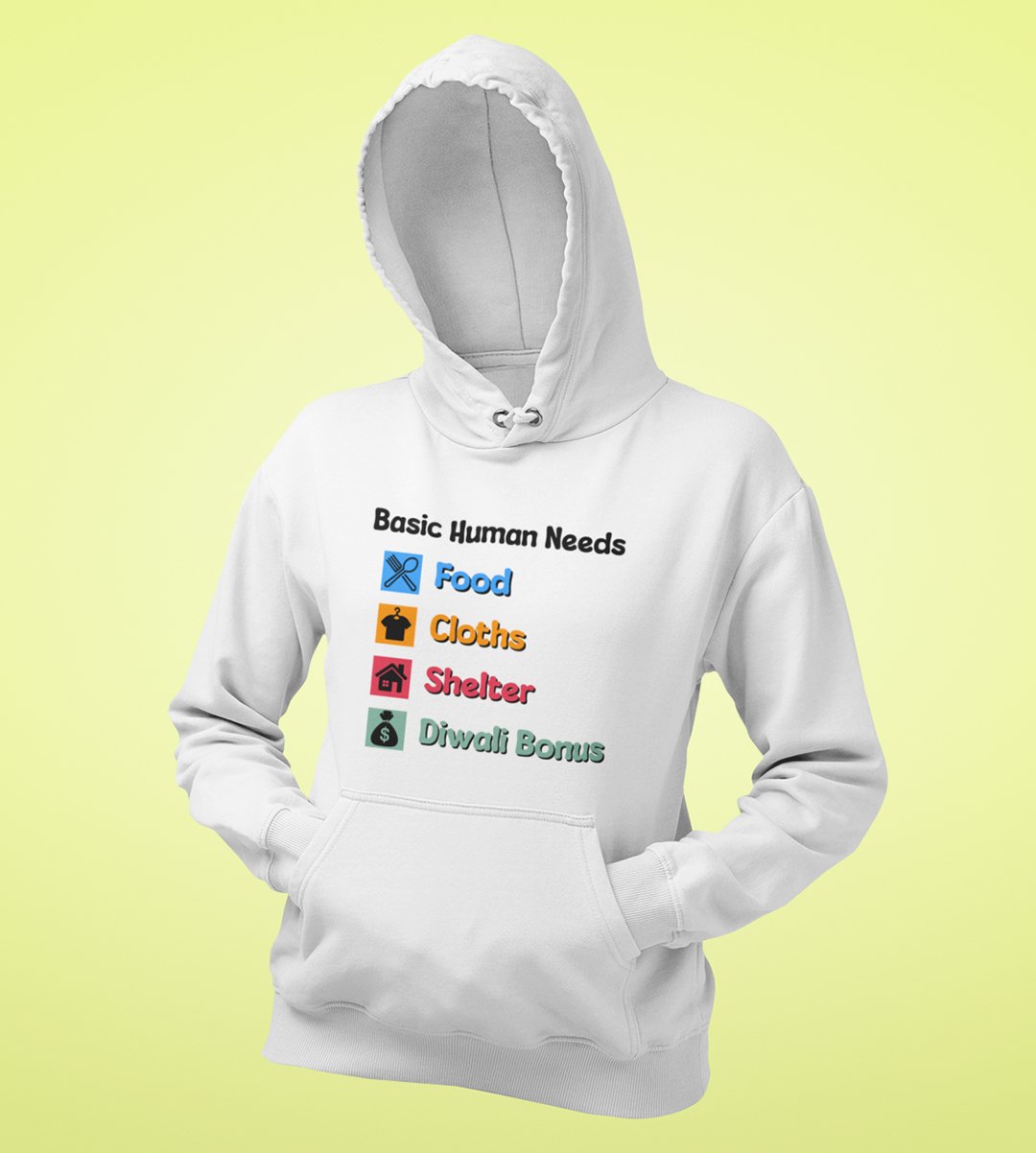 Celebrate the season of abundance with our "Diwali Bonus Delight" White Hoodie . This humorous design humorously adds "Diwali Bonus" to the list of essentials - Food, Clothes, Shelter, and Diwali Bonus. Join the laughter and revel in the anticipation of the coveted yearly tradition as every sip becomes a bonus in itself.