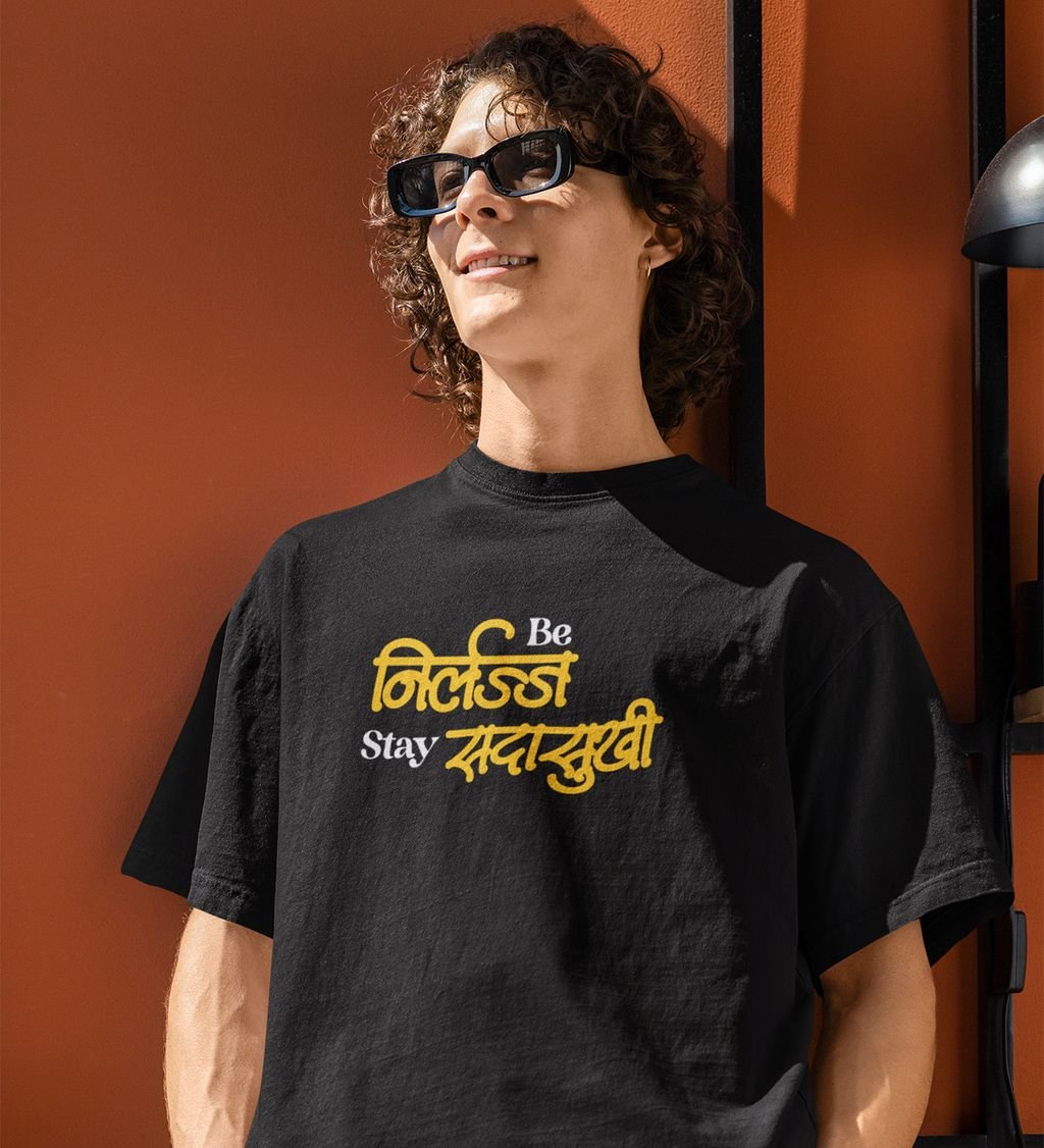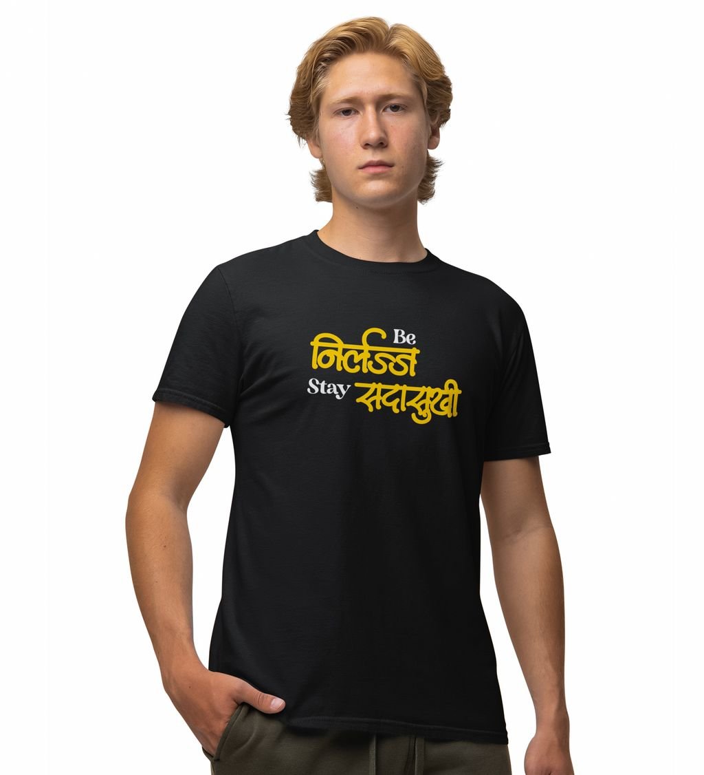 Be Shameless Stay Happy Black Round Neck Cotton Half Sleeved Mens T Shirt with Printed Graphics