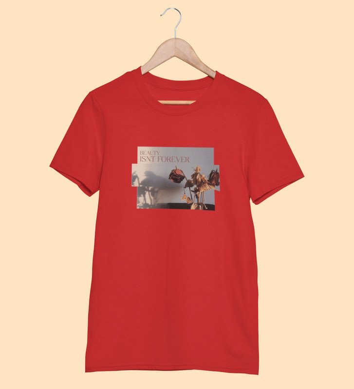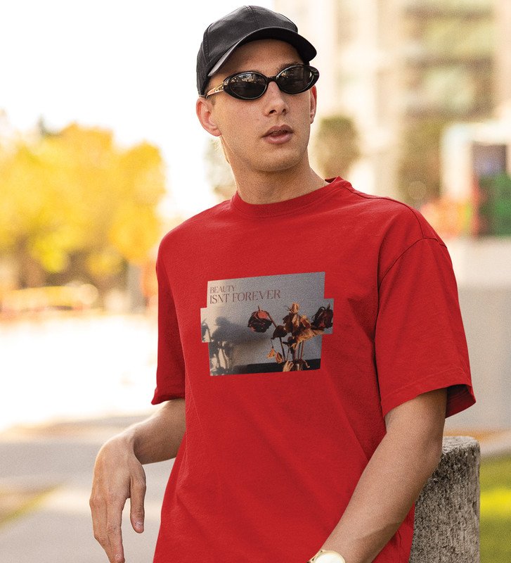 Beauty Decays, Red Trendsetter Series: Men's Oversized Tee with Front Print Appeal