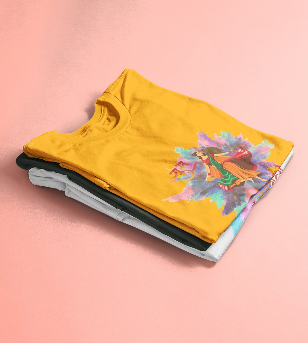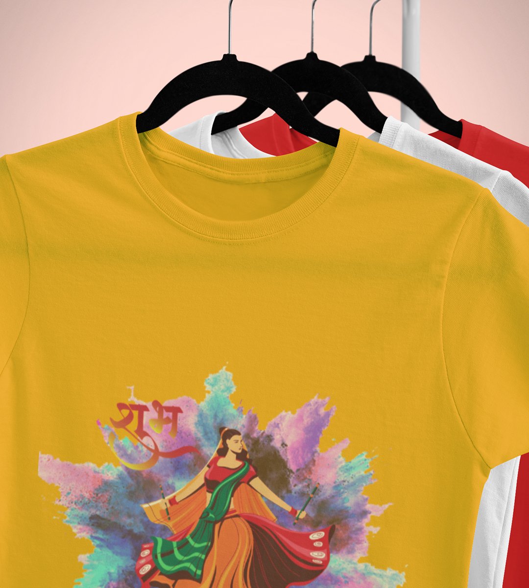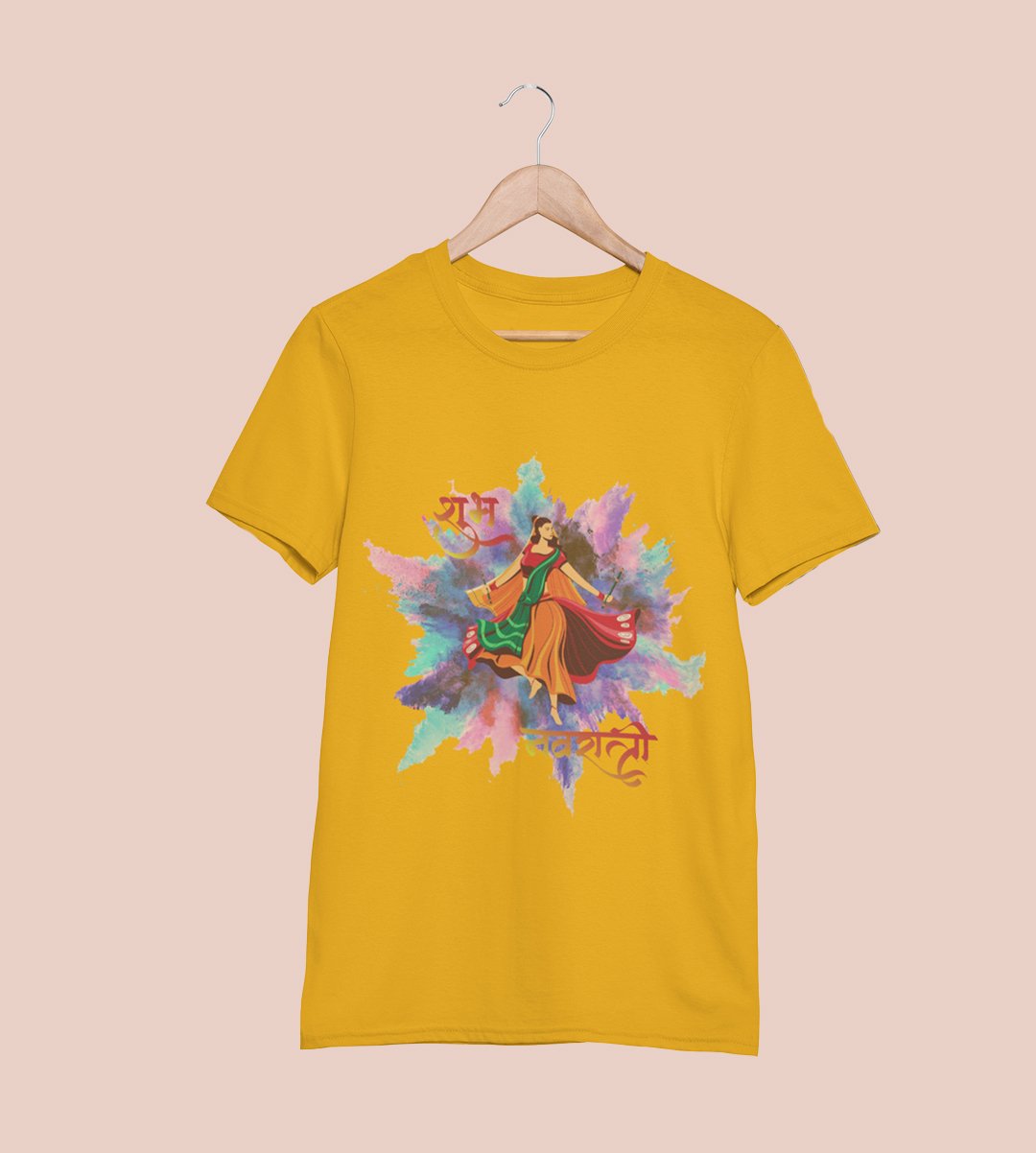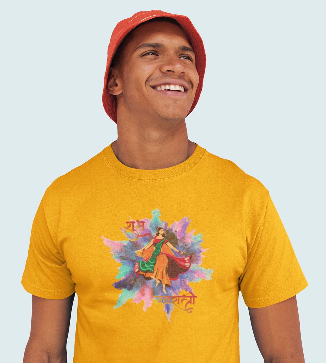 Blasting colours printed unisex adults round neck cotton half-sleeve yellow tshirt specially for Navratri festival/ Durga puja