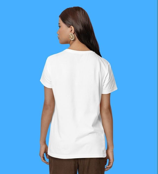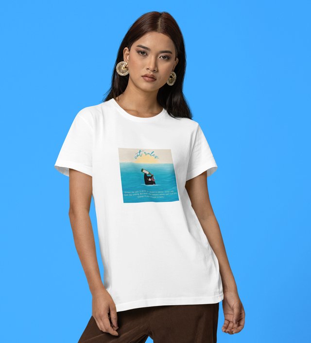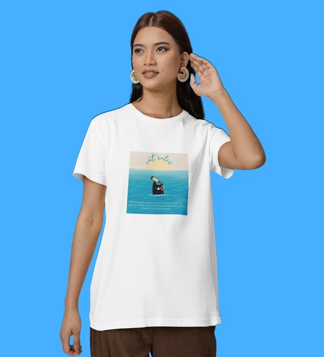 Blue Horizon: Cat Daydreaming Scene Graphic Printed White T-Shirt