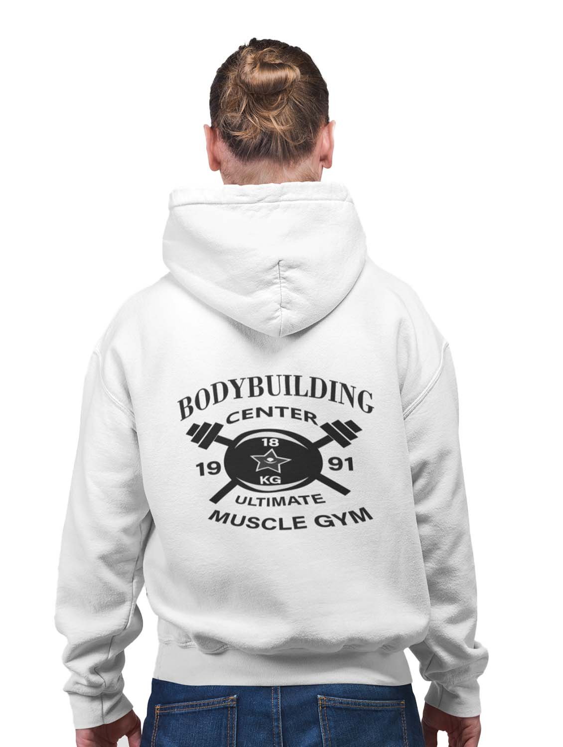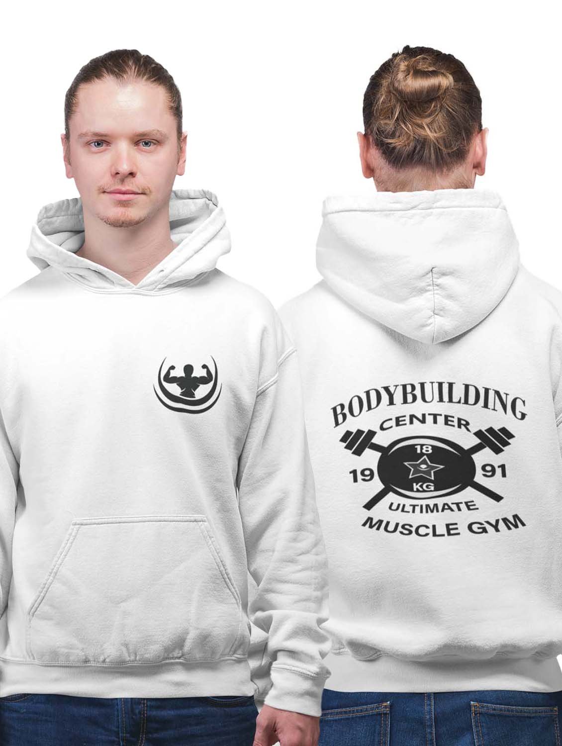 Bodybuilding Center, Ultimate Muscle Gym printed artswear white hoodies for winter casual wear specially for Men