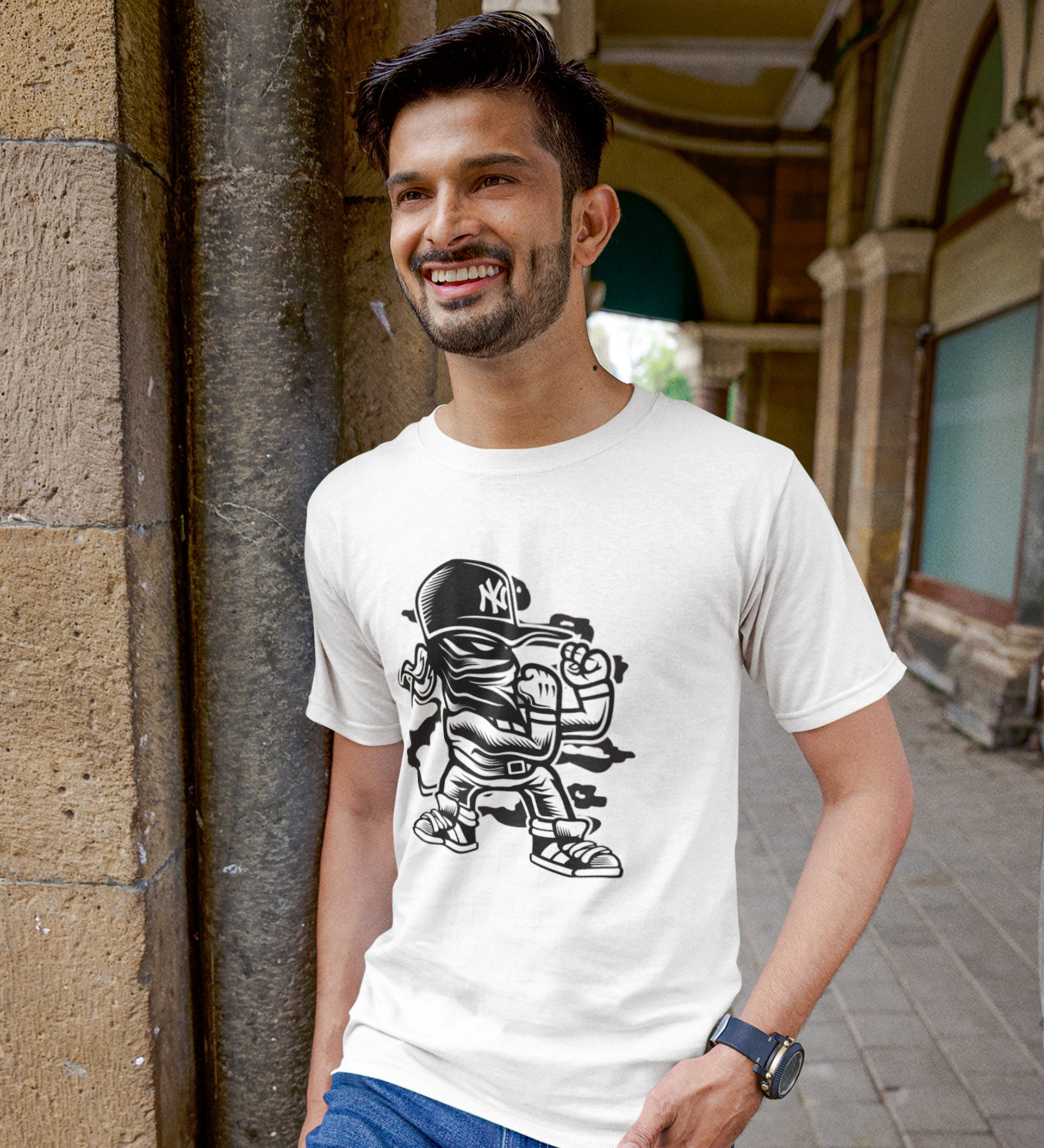Power Punch Ready White Round Neck Cotton Half Sleeved Men's T-Shirt with Printed Graphics