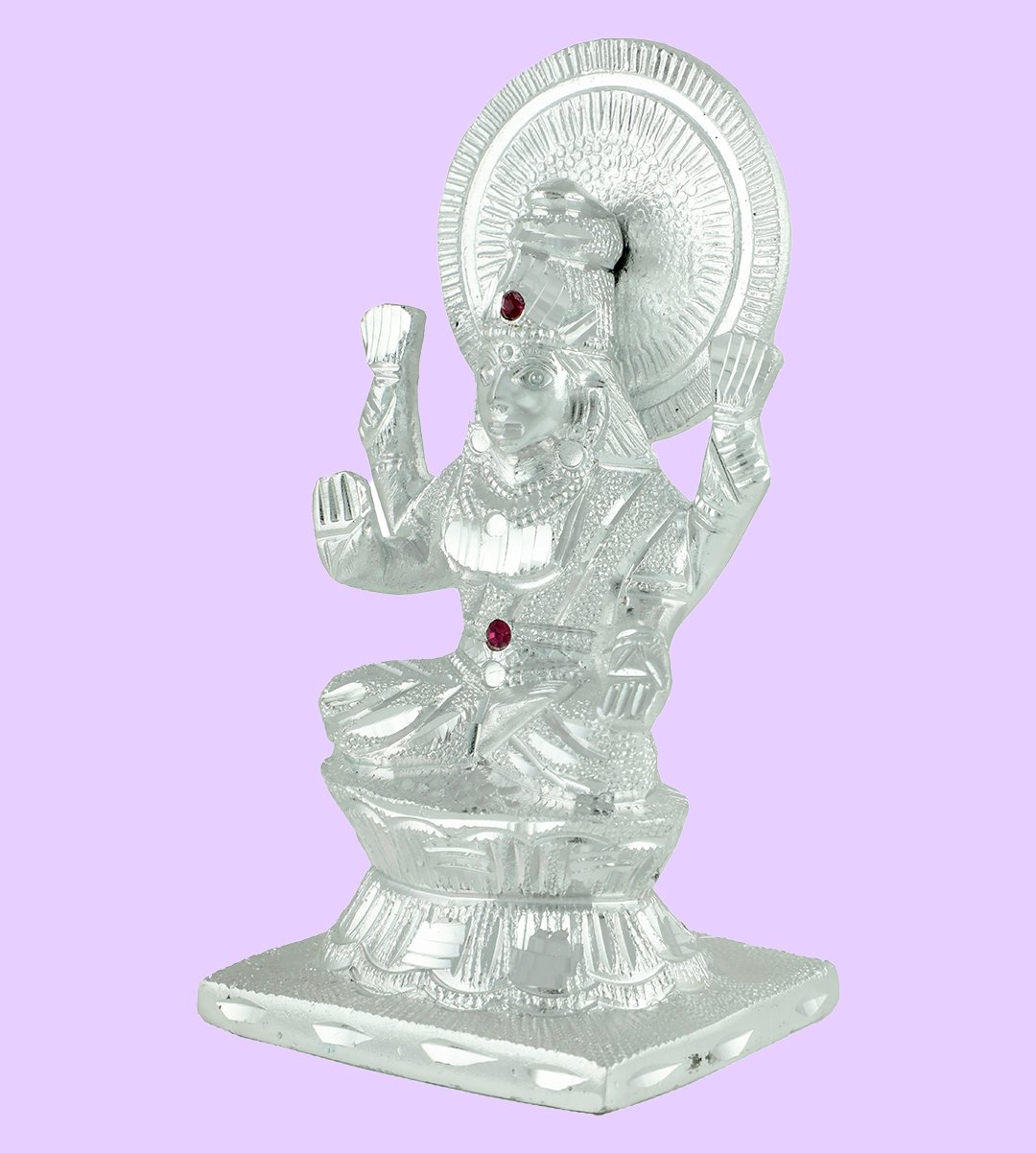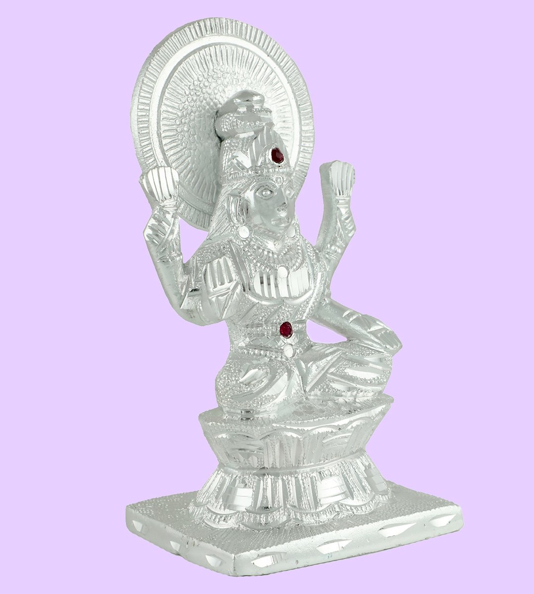 Brass silver handcrafted goddess lakshmi idol sitting in choki is for prosperity and good luck to your family members. It is non-toxic and bacteria free metal. It accords divine and this decorative figurine which reflects the artistic brilliance and adds elegance to your decor. Style your home and office with this cold cast resin statue, sure to be admired by your guests it is embellished with beautiful paint. Maa lakshmi blesses you with wealth, fortune, beauty, joy and prosperity. Her face has divine features. It is a small idol but the wormanship is excellent. According to hindu culture, four hands of maa lakshmi represents 4 aspects of human life: dharma, karma, artha and moksha. Keep this idol at your home, puja ghar, work desk or office for protection, happiness, positivity, good health and mental strength. This figurine serves as a significant gift, especially around auspicious hindu religion's celebrations and festivities. Best gifting material to your family, friends and dear ones. Do use dry cloth to clean the idol. Keep away from chemical liquids.