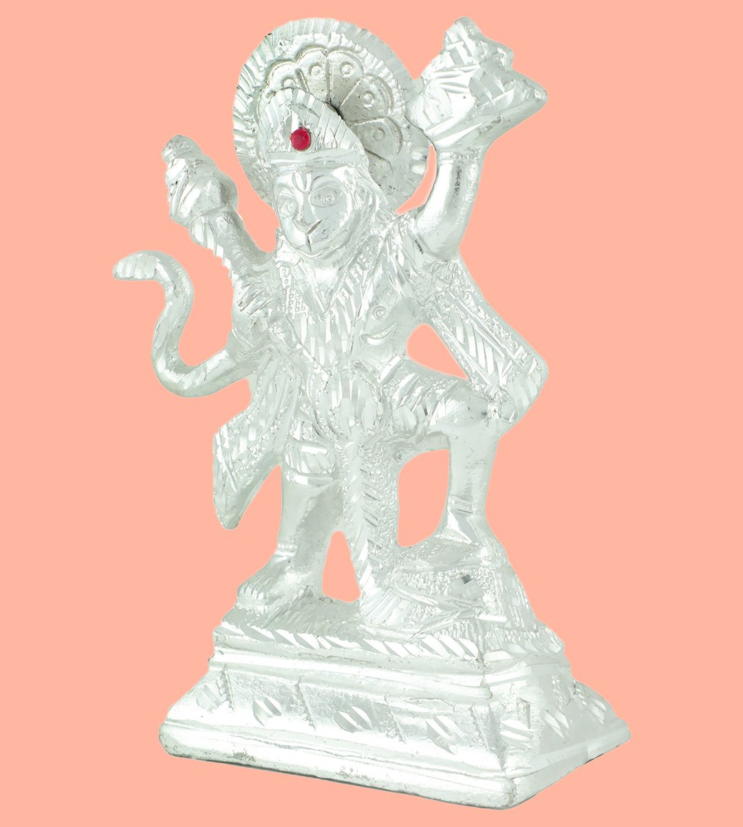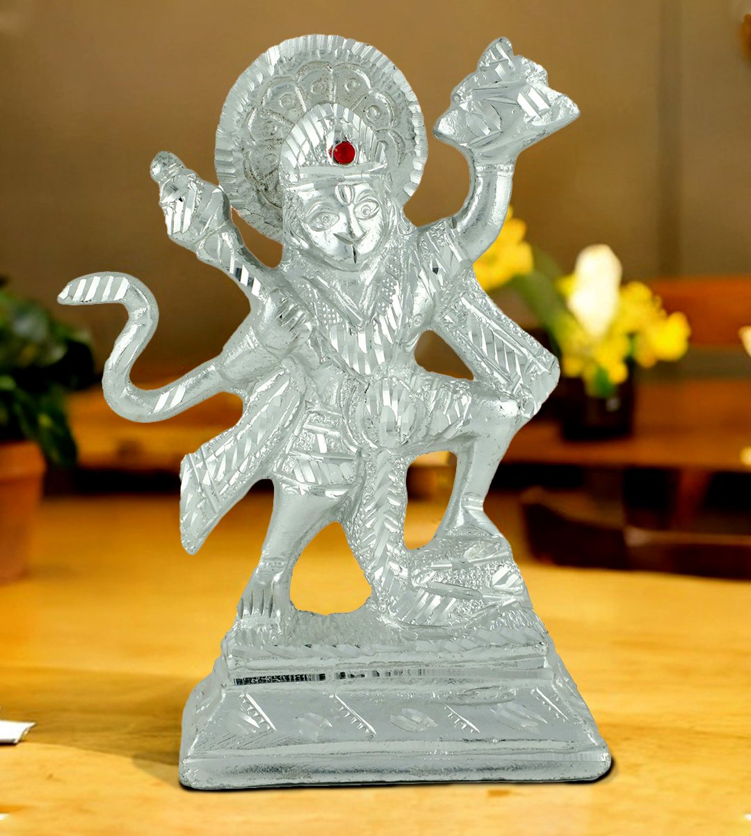 Brass metal silver handcrafted standing Lord Hanuman idol dispels fear and accords divine. Enlighten your home with handcrafted standing Lord Hanuman idol with Gada/mace, decorative figurine which reflects the artistic brilliance and adds elegance to your decor. Style your home and office with this cold cast bronze resin statue, sure to be admired by your guests it is embellished with beautiful paint. When laxman was severely wounded during the battle against Ravana, Hanuman went to fetch Sanjivini herb from Dronagiri mountain. And so we can see in trhis murti where lord hanuman has Dronagiri mountain in his hand. This figurine serves as a great gift, especially around hindu religion's celebrations and festivities. This piece reflects the artistic qualities and time one has taken to shape this product. Exquisitely designed and intricately crafted, it makes for a perfect gifting option.