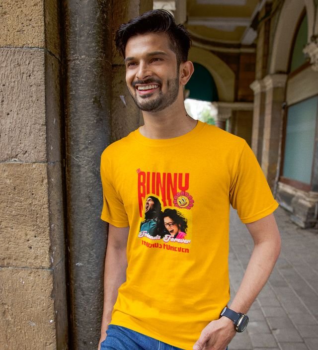 Bunny & Naina Yellow Round Neck Cotton Half Sleeved Men T-Shirt with Printed Graphics