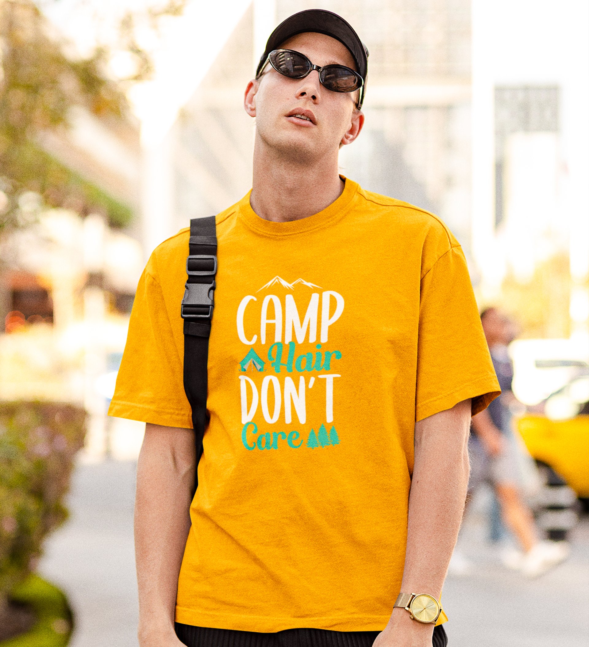 Camp hair dont care - Yellow and white text Printed t-shirts - Clothes for travellers and riders -for mens - suitable for all kinds of Adventurous journey- best gifting item for friends and family.