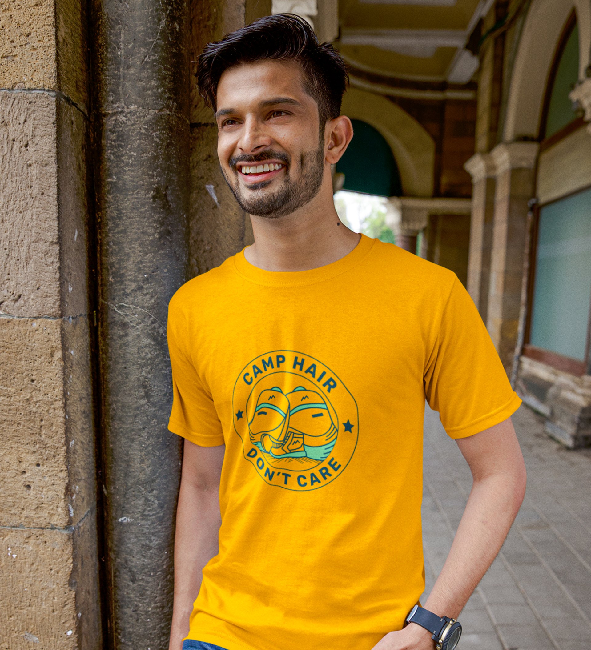 Camp hair dont care - Yellow Printed t-shirts - Clothes for travellers and riders -for mens - suitable for all kinds of Adventurous journey- best gifting item for friends and family.