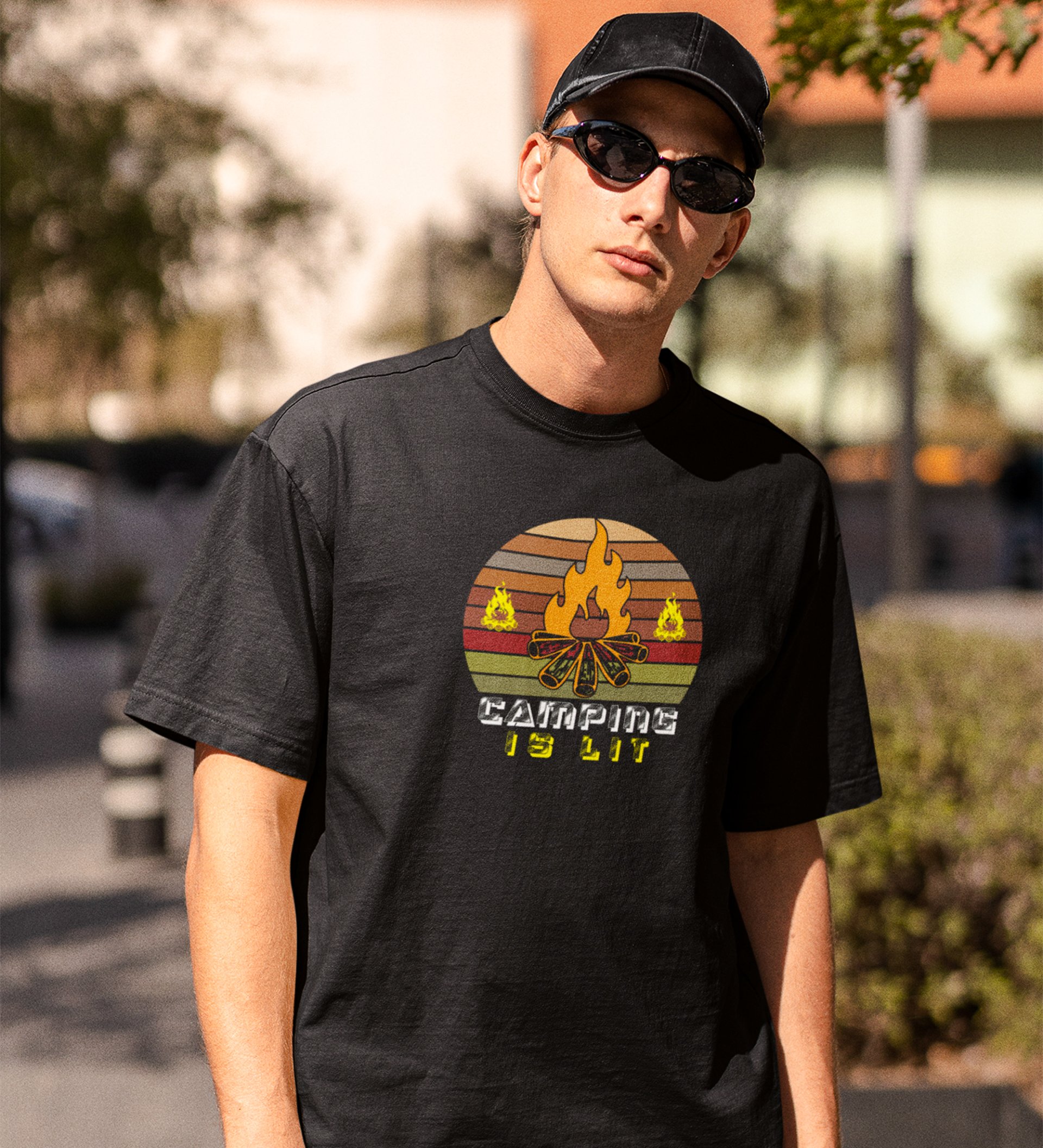JD.TRENDS Camping Is Lit Black Round Neck Cotton Half Sleeved Men's T-Shirt with Printed Graphics