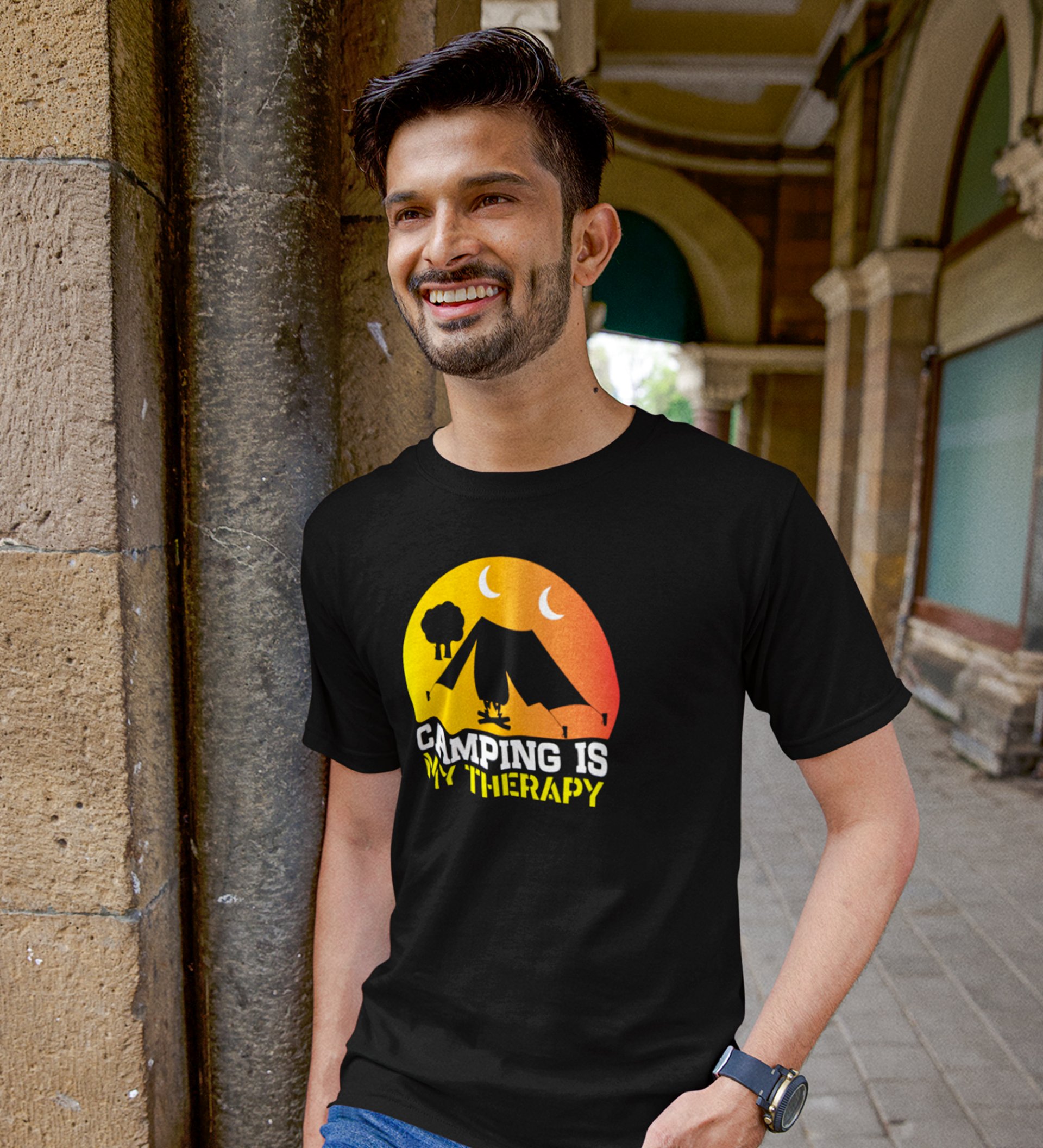 JD.TRENDS Camping is my therapy (Yellow Sillhoutte) Black Round Neck Cotton Half Sleeved Men's T-Shirt with Printed Graphics