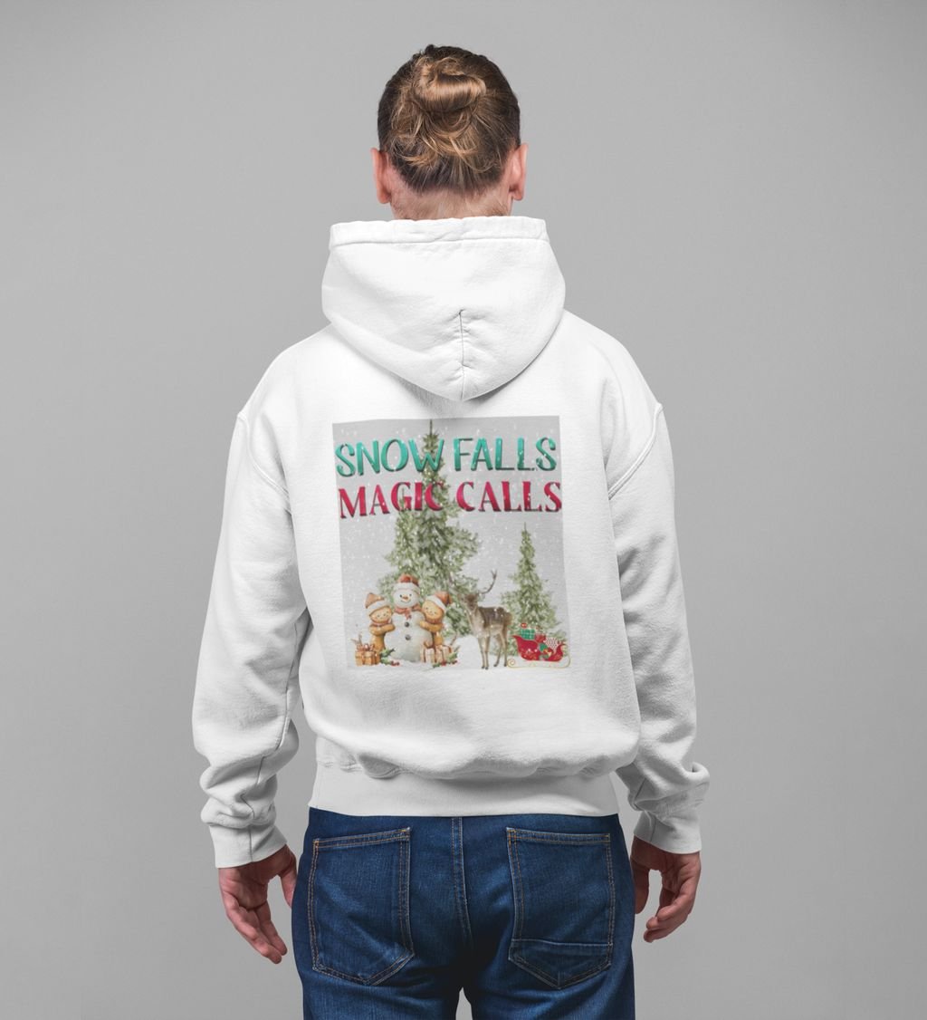 Charming Snowmen and Deer Enjoying the Magical Snowfall Printed White Cotton Hoodie