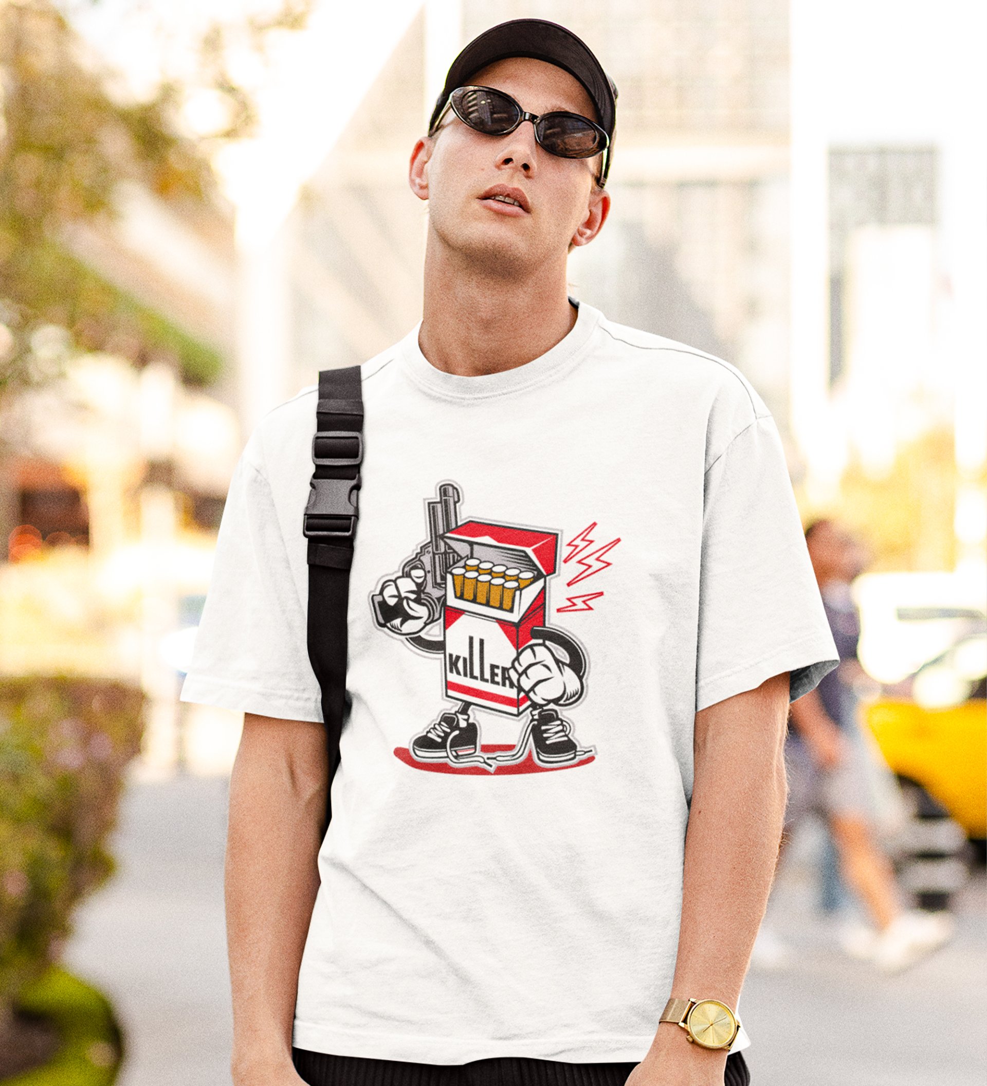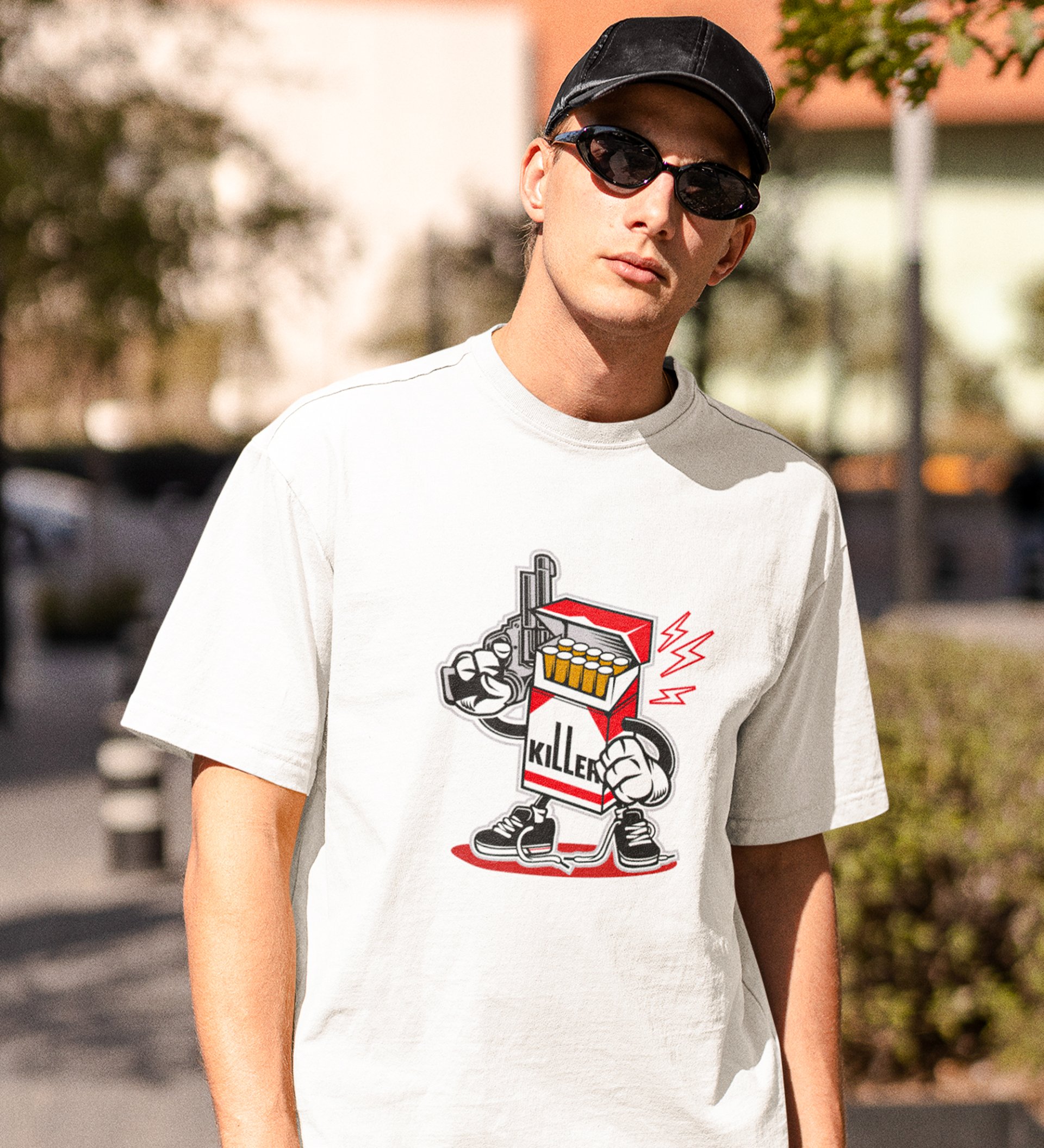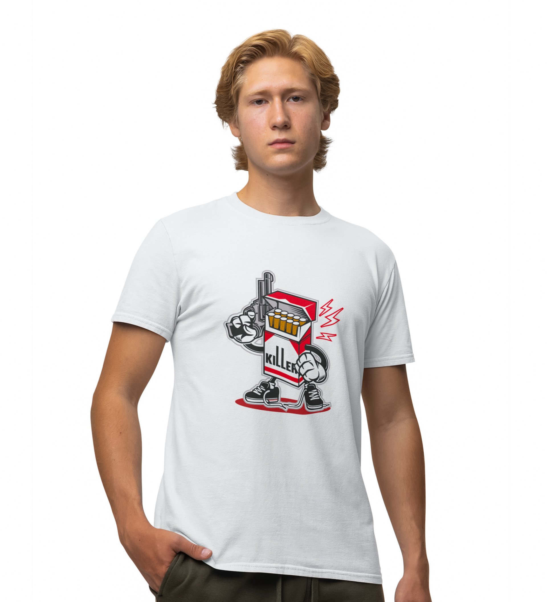 Cigrette Killer White Round Neck Cotton Half Sleeved Men's T-Shirt with Printed Graphics