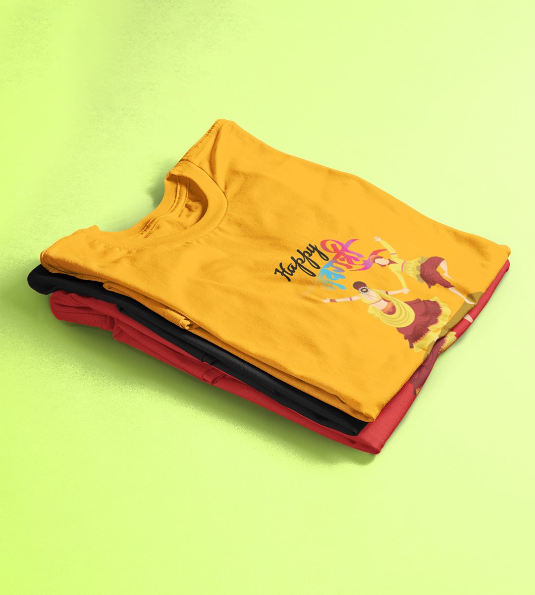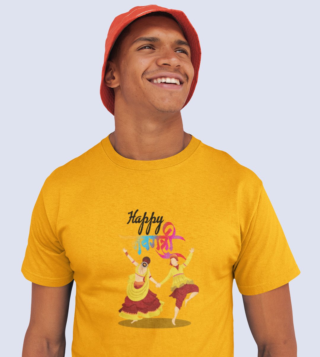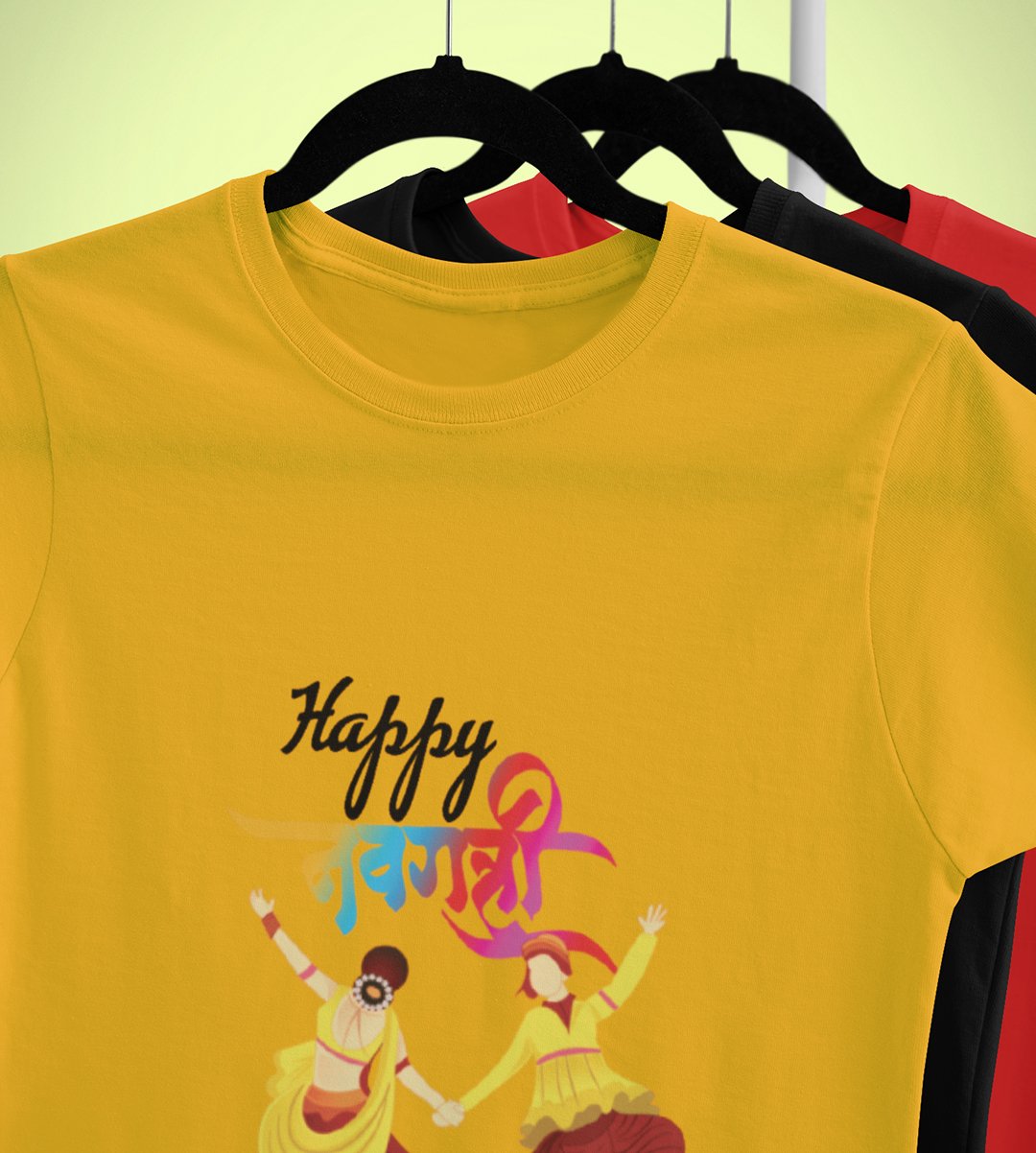 Colourful navratri text printed unisex adults round neck cotton half-sleeve yellow tshirt specially for Navratri festival/ Durga puja
