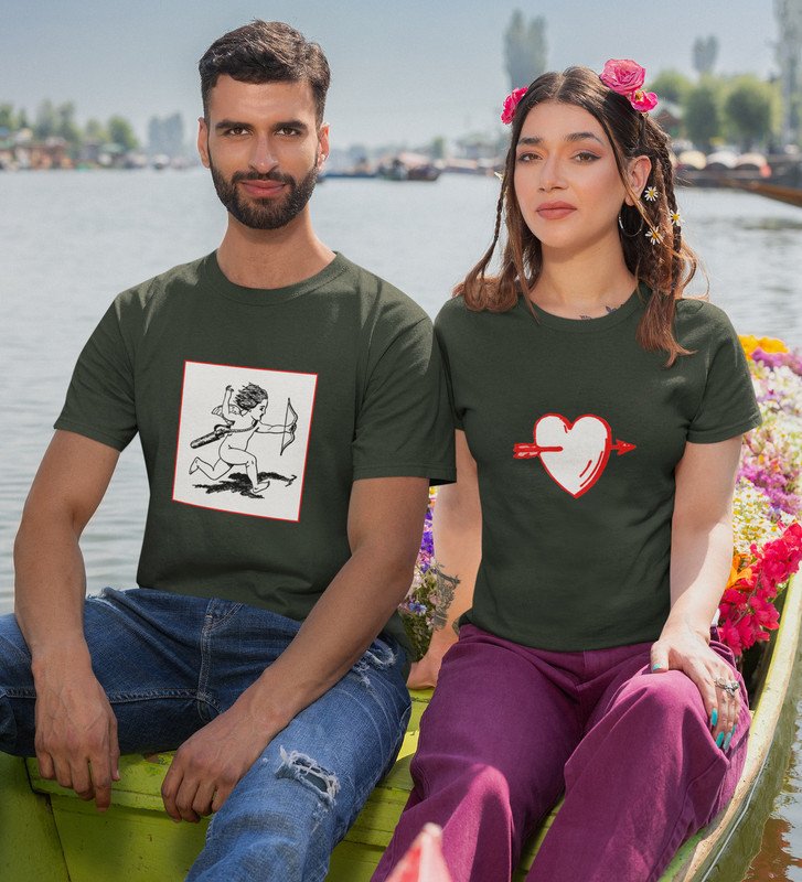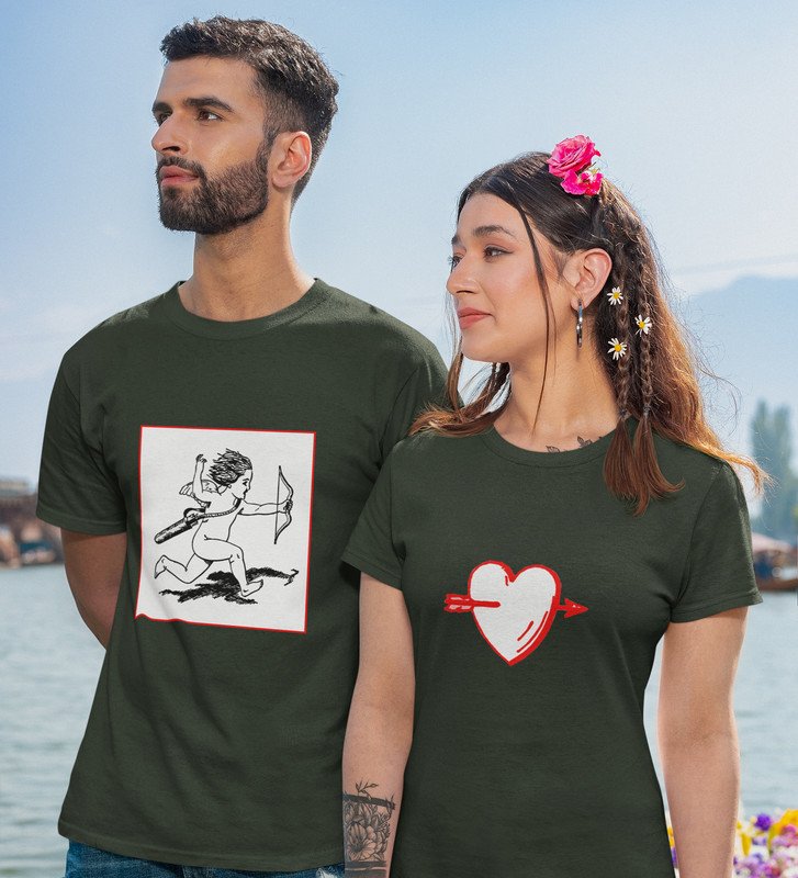 Cupid Hitting Arrow, Printed (green) T-shirts For Couples