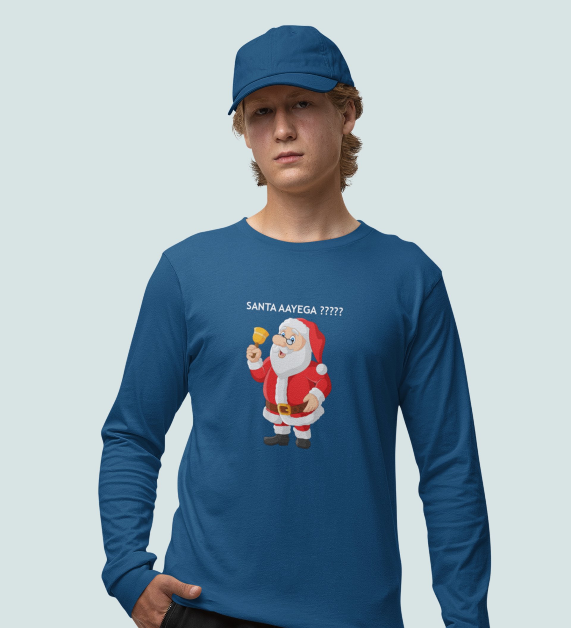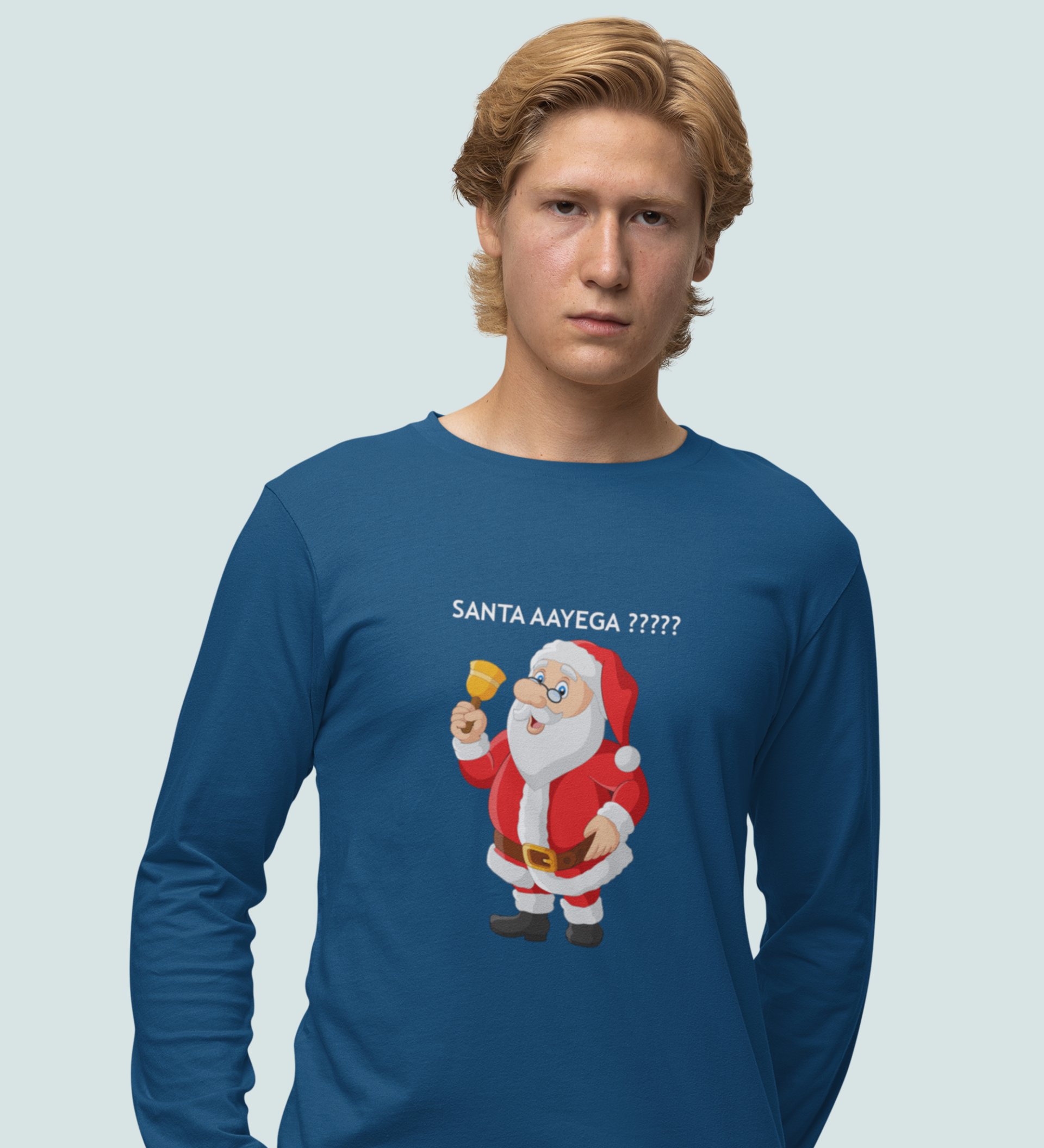 Curious Santa: Cute DesignerFull Sleeve T-shirt Blue Best Gift For Kids Boys Girls