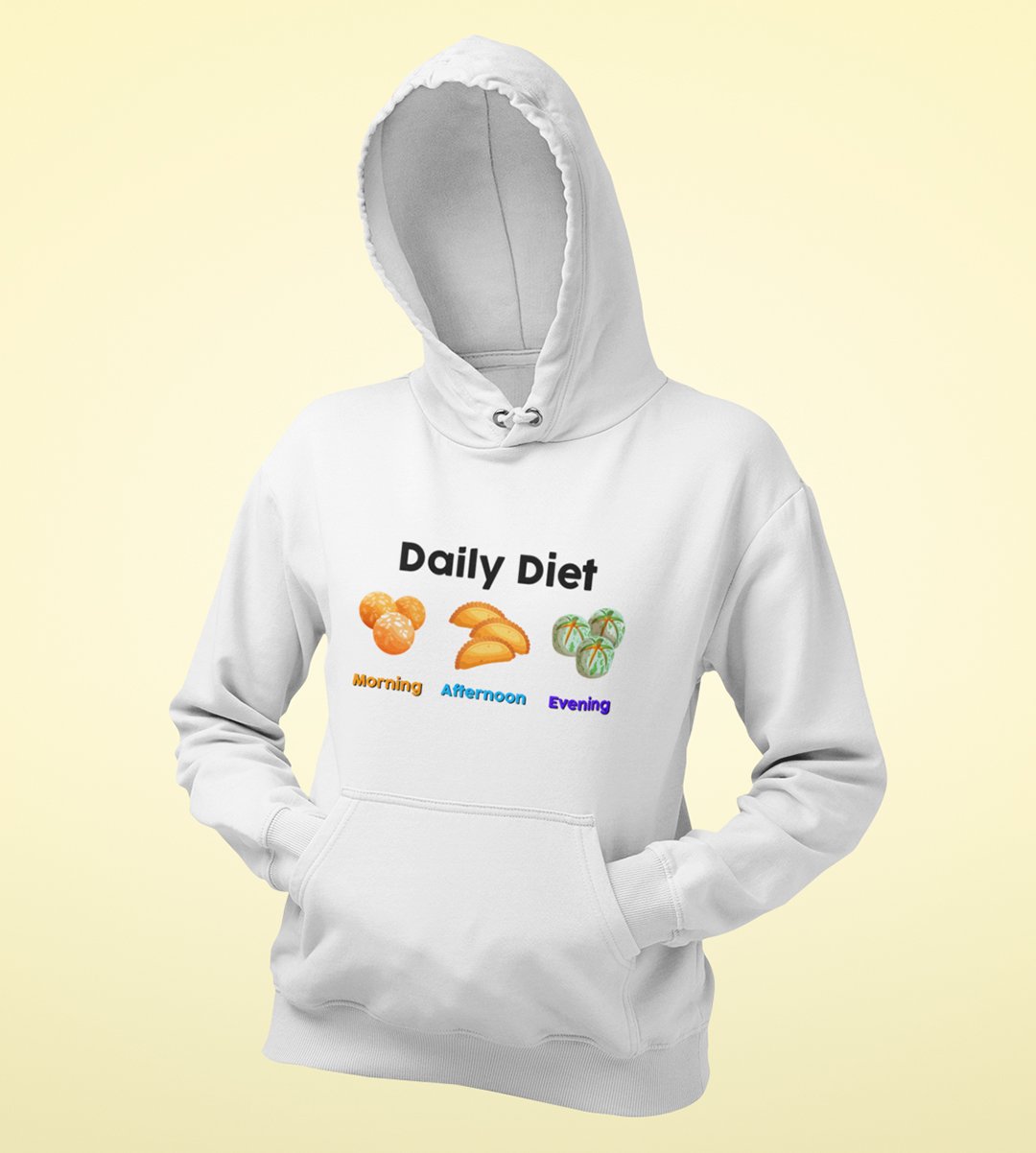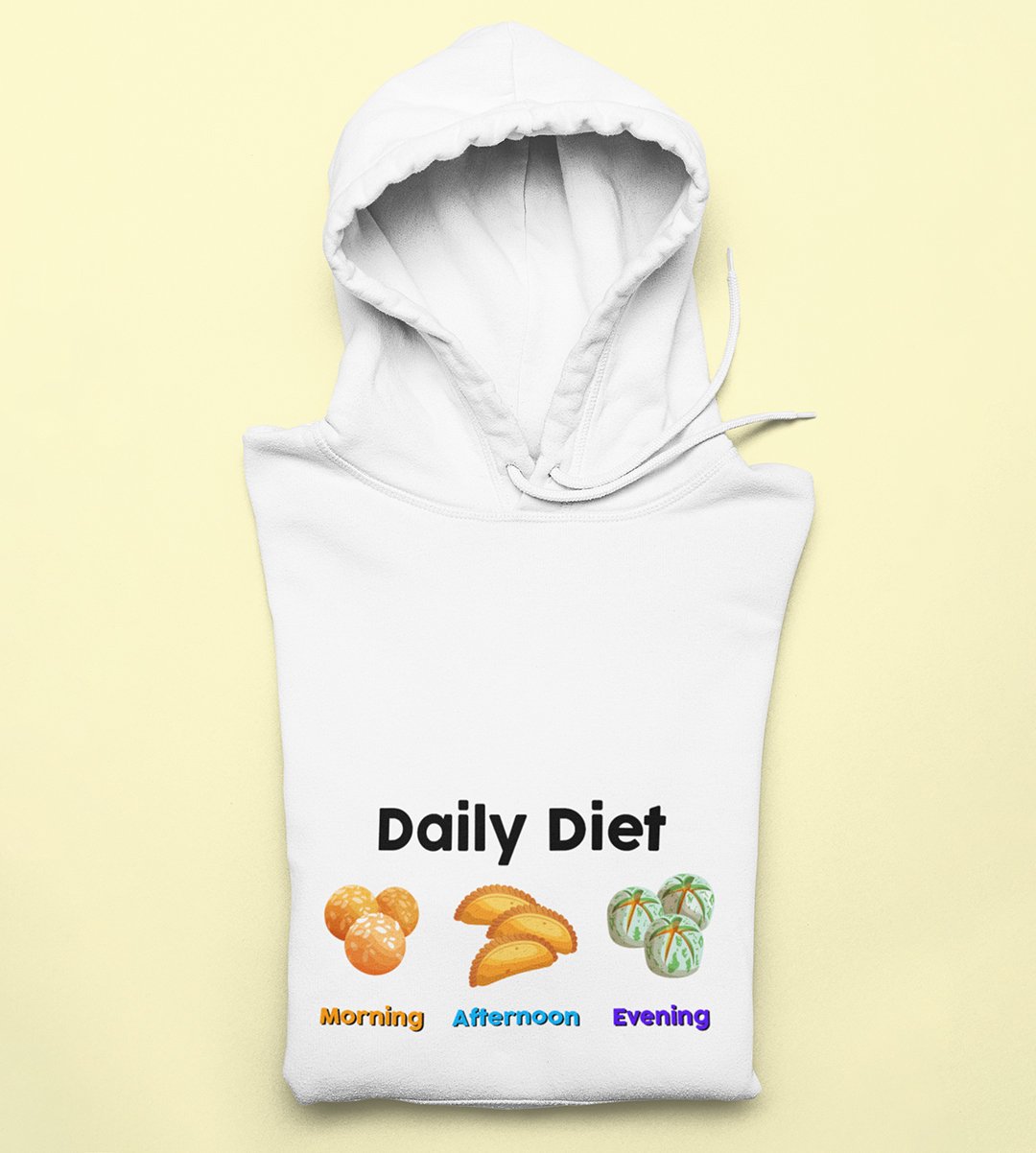 Indulge in the sweetest daily routine with our "Diwali Sweet Lover's Daily Diet" White Hoodie . This hilarious design showcases the typical daily schedule of a sweet tooth, complete with morning, afternoon, and evening sweets. It's a delightful reminder that every hour is a good time for dessert. Enjoy your favorite beverages with a touch of humor and sweetness during the festival of lights.
