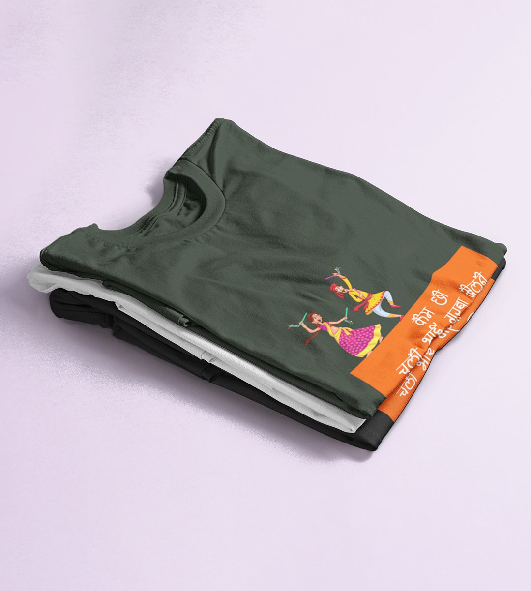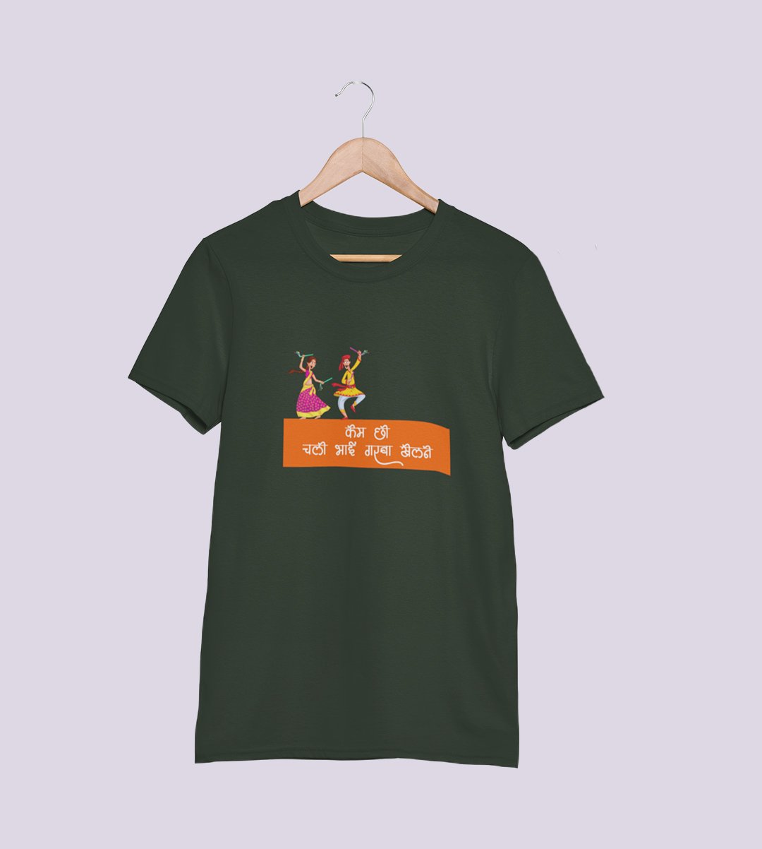 Dancing couple (BG orange) printed unisex adults round neck cotton half-sleeve green tshirt specially for Navratri festival/ Durga puja