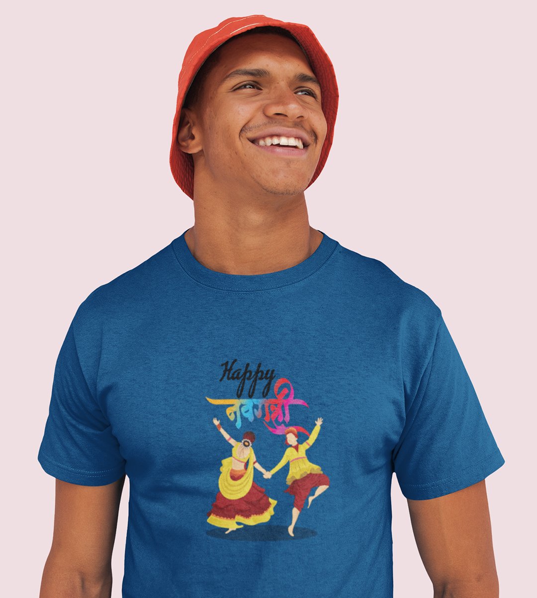 Dancing couple printed unisex adults round neck cotton half-sleeve blue tshirt specially for Navratri festival/ Durga puja