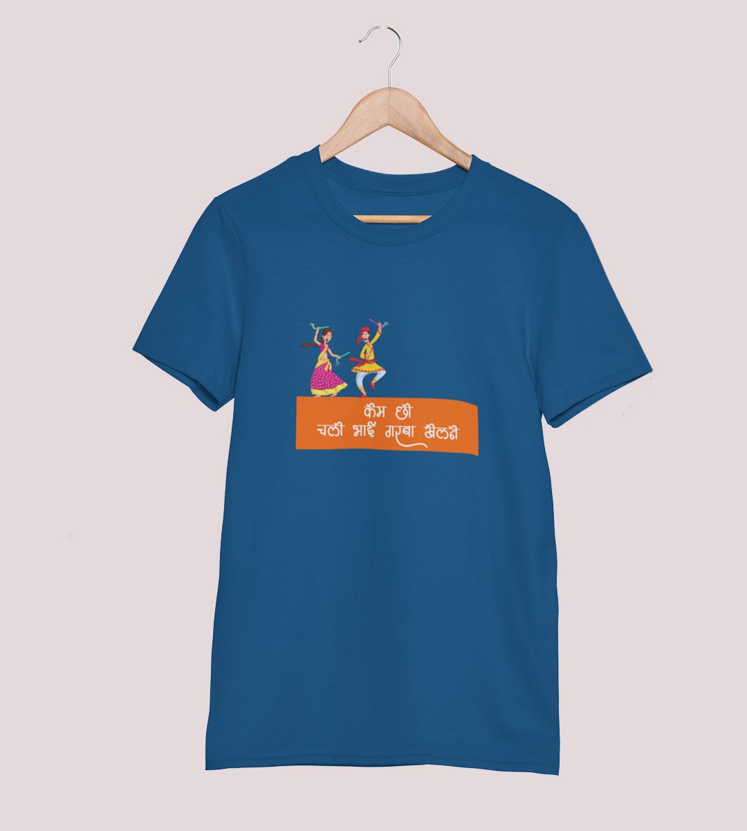 Dancing couple (small) printed unisex adults round neck cotton half-sleeve blue tshirt specially for Navratri festival/ Durga puja