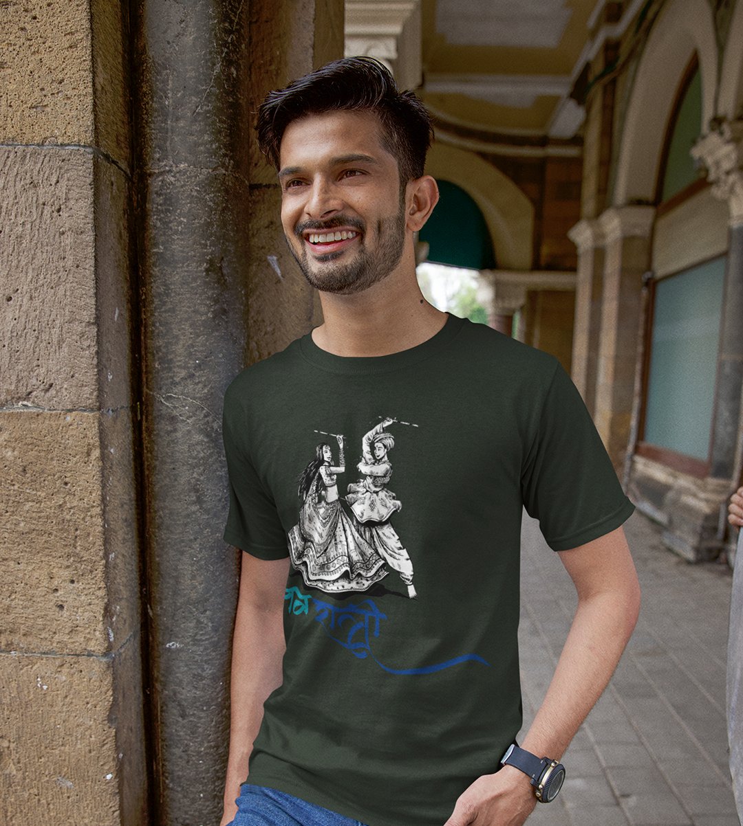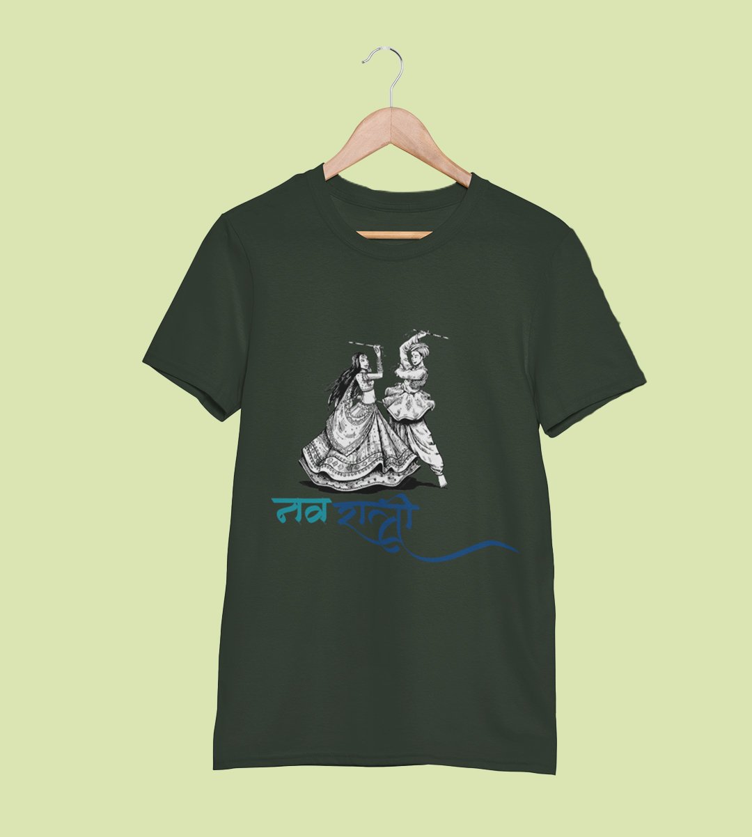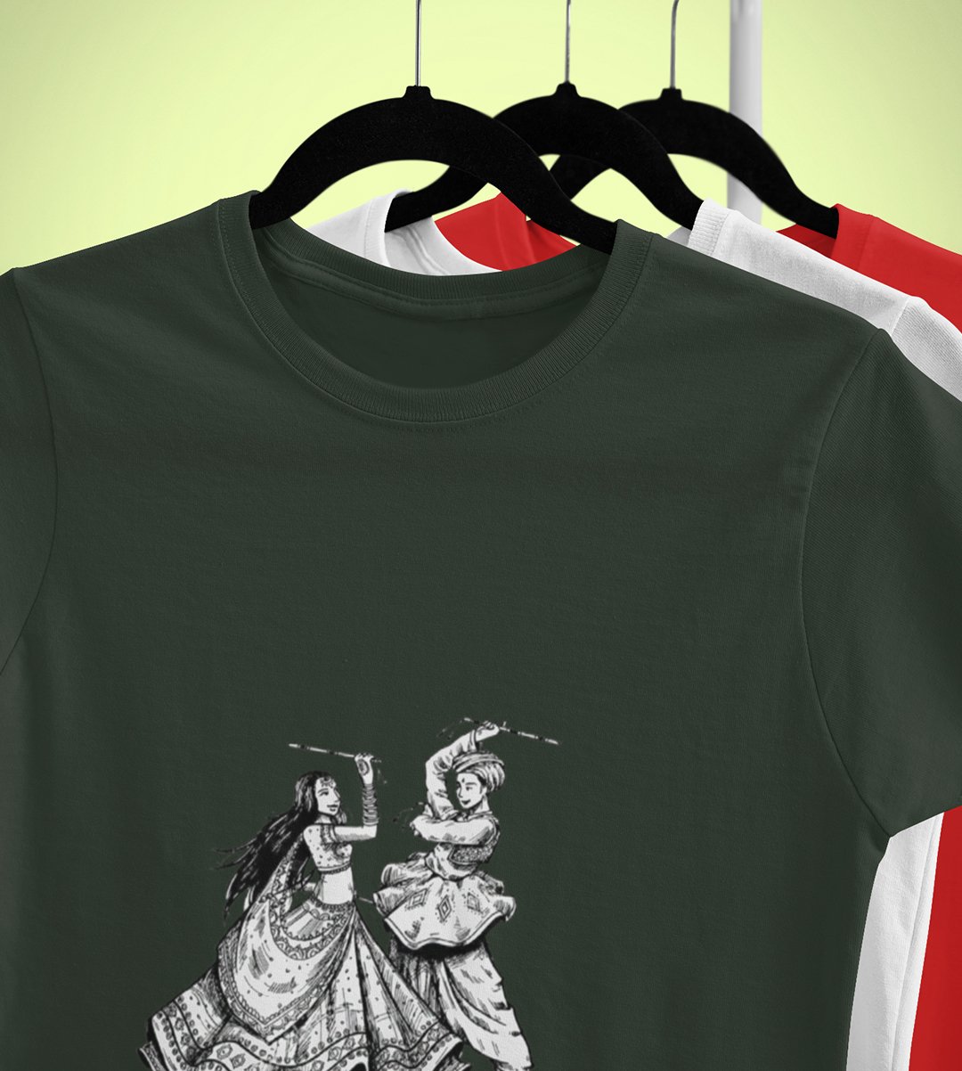 Dancing garba couple printed unisex adults round neck cotton half-sleeve green tshirt specially for Navratri festival/ Durga puja