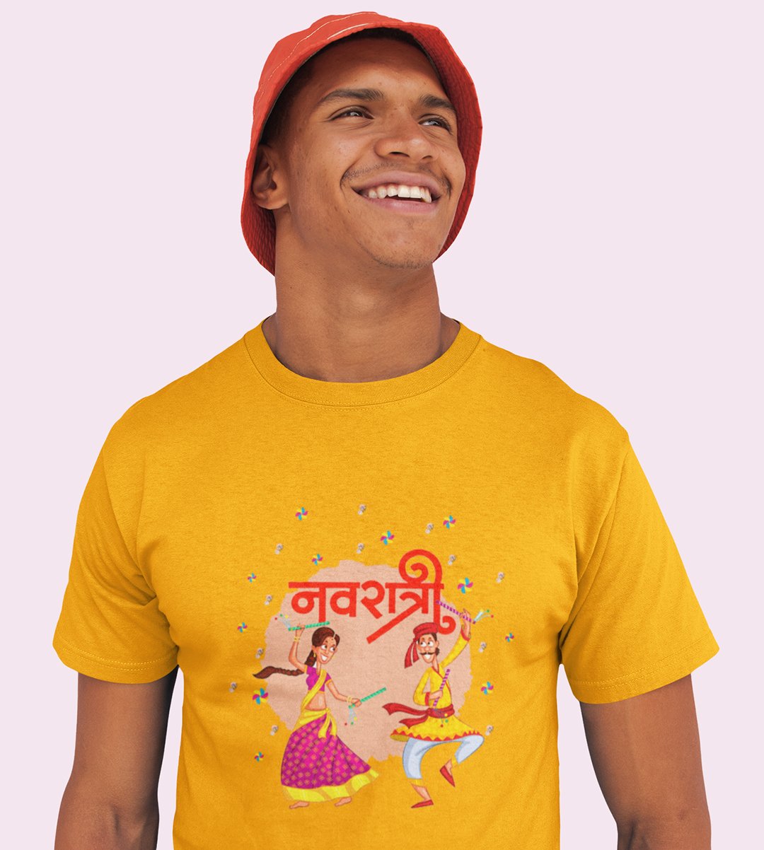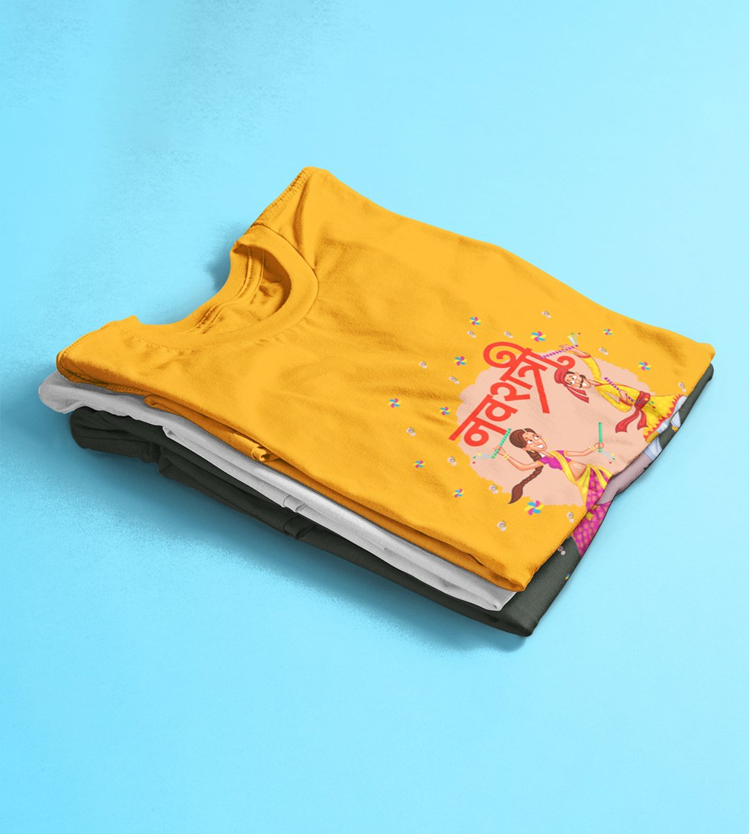 Dancing garba printed unisex adults round neck cotton half-sleeve yellow tshirt specially for Navratri festival/ Durga puja