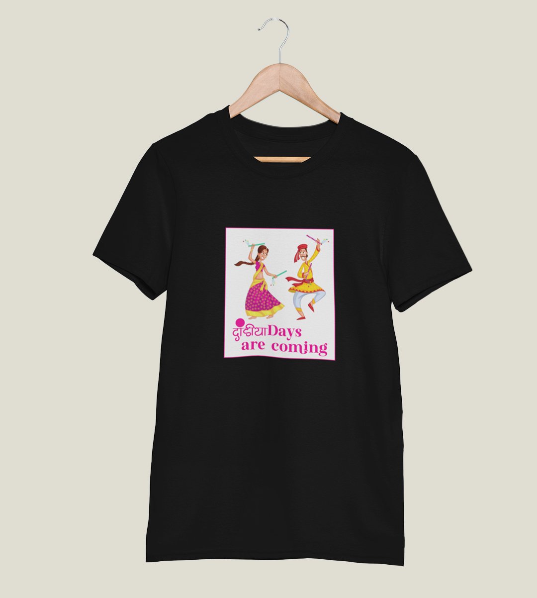Dandiya days are coming printed unisex adults round neck cotton half-sleeve black tshirt specially for Navratri festival/ Durga puja