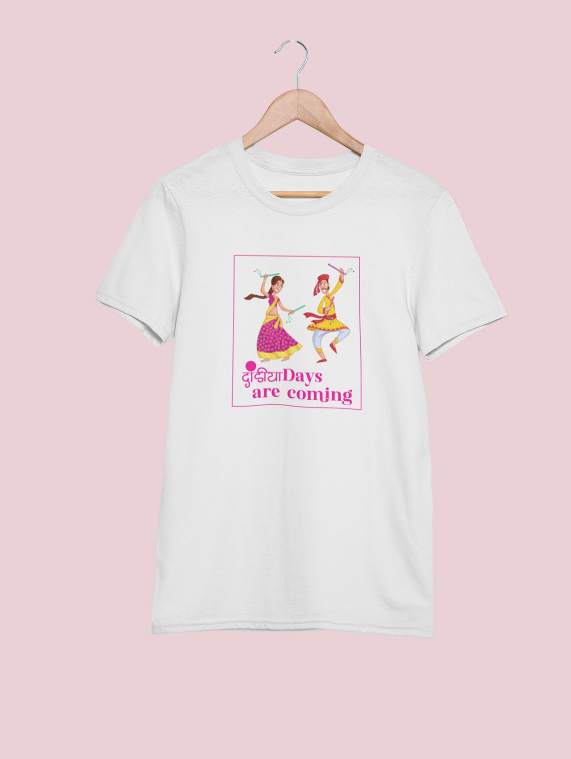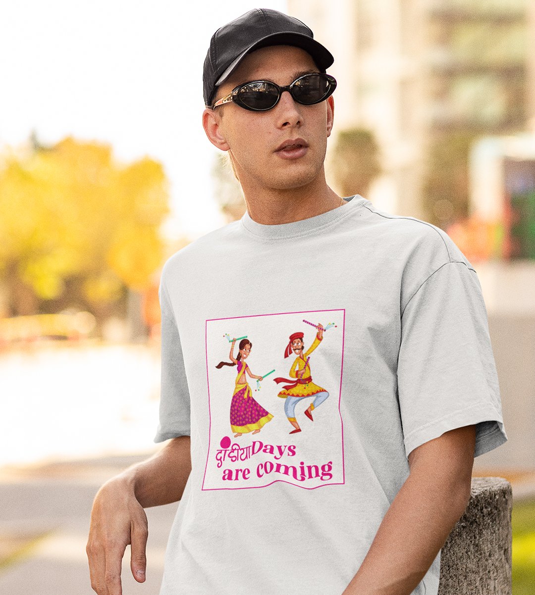 Dandiya days are coming printed unisex adults round neck cotton half-sleeve white tshirt specially for Navratri festival/ Durga puja