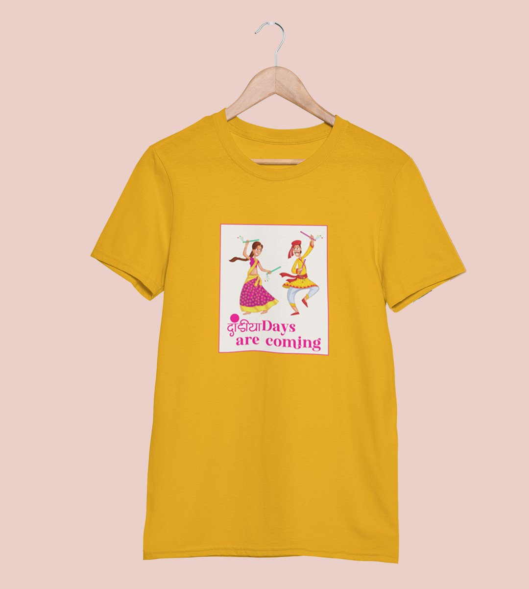 Dandiya days are coming printed unisex adults round neck cotton half-sleeve yellow tshirt specially for Navratri festival/ Durga puja