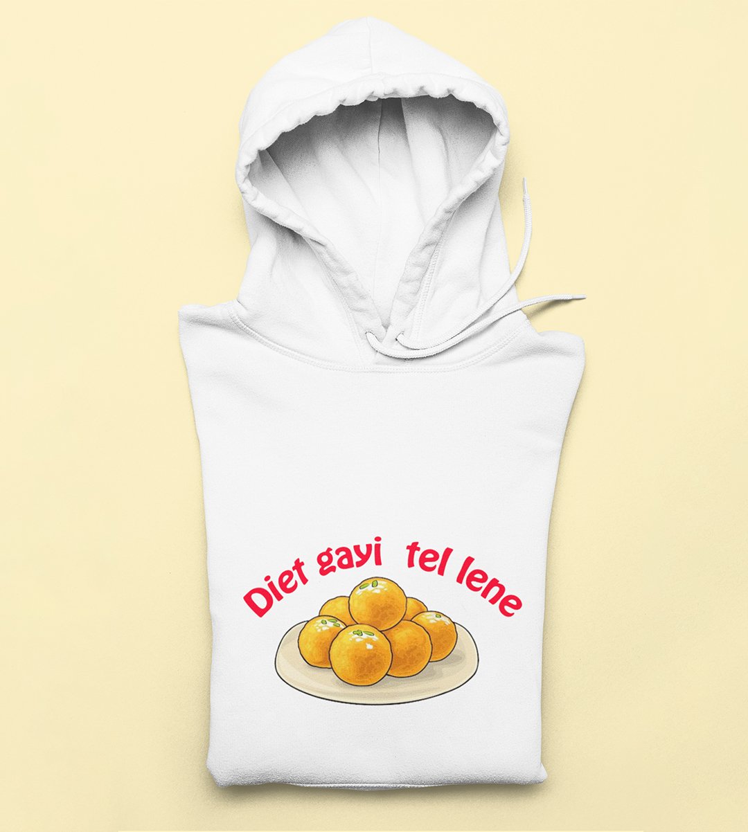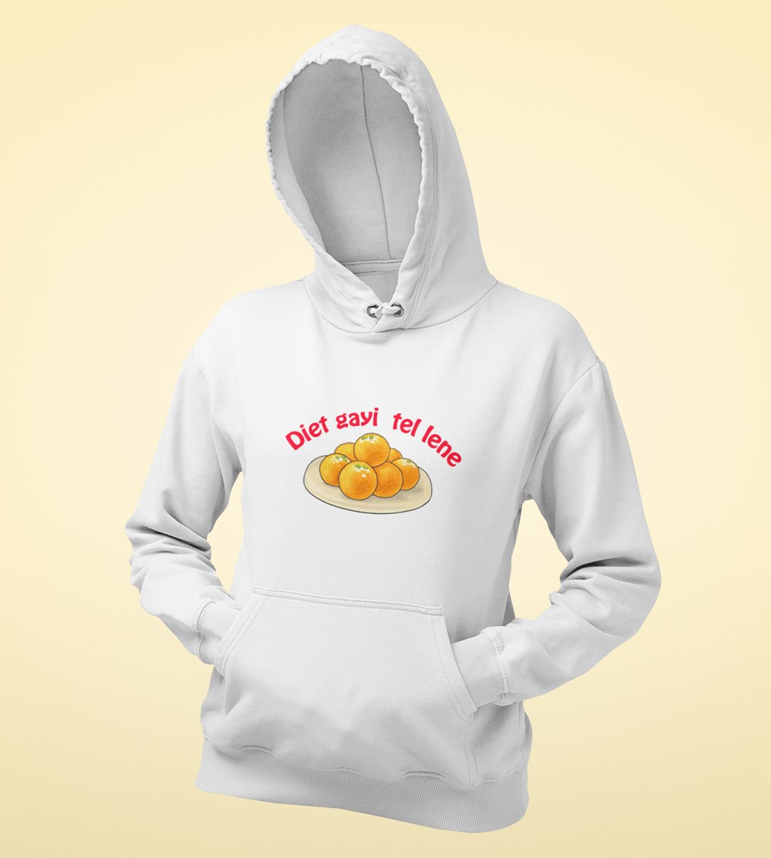 Celebrate the irresistible sweet temptations of Diwali with our "Diwali Sweet Temptations" White Hoodie . The humorously relatable message "Diet Gayi Tel Lene" captures the struggle to resist delectable treats. Sip your and enjoy a guilt-free laugh over Diwali's culinary indulgences.