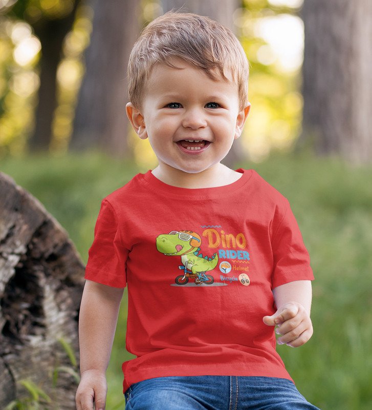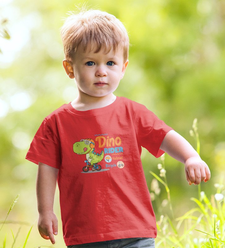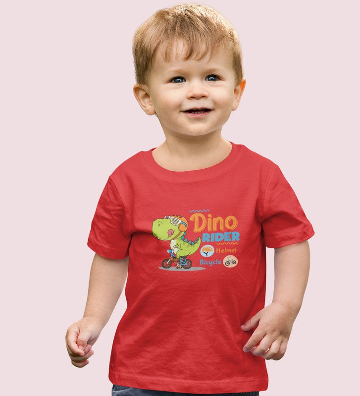 Dino Rider, Boys Round Neck Printed Blended Cotton T-shirt (Red)