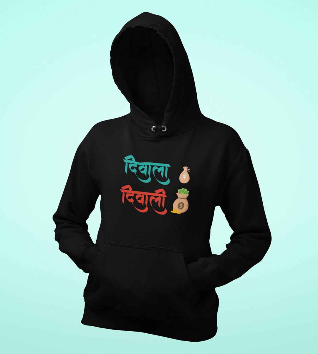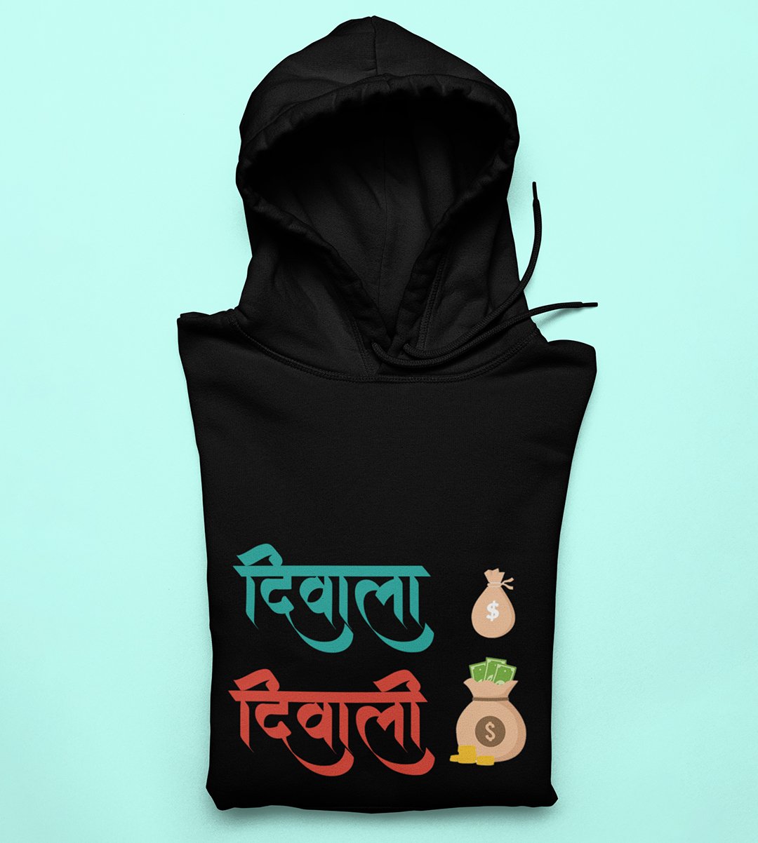 Celebrate the journey from "Divala" to "Diwali" with our black Hoodie . This unique design in Hindi font showcases the transformation of fortunes, from times of no money to the abundance of Diwali. Sip your and reflect on the cycles of wealth and prosperity that define the festival.