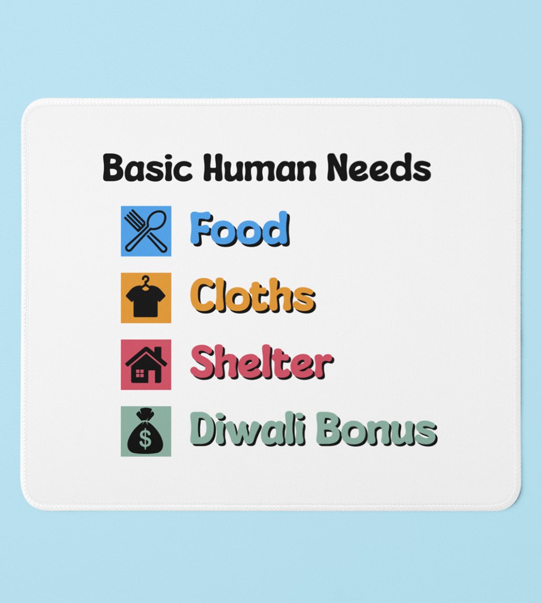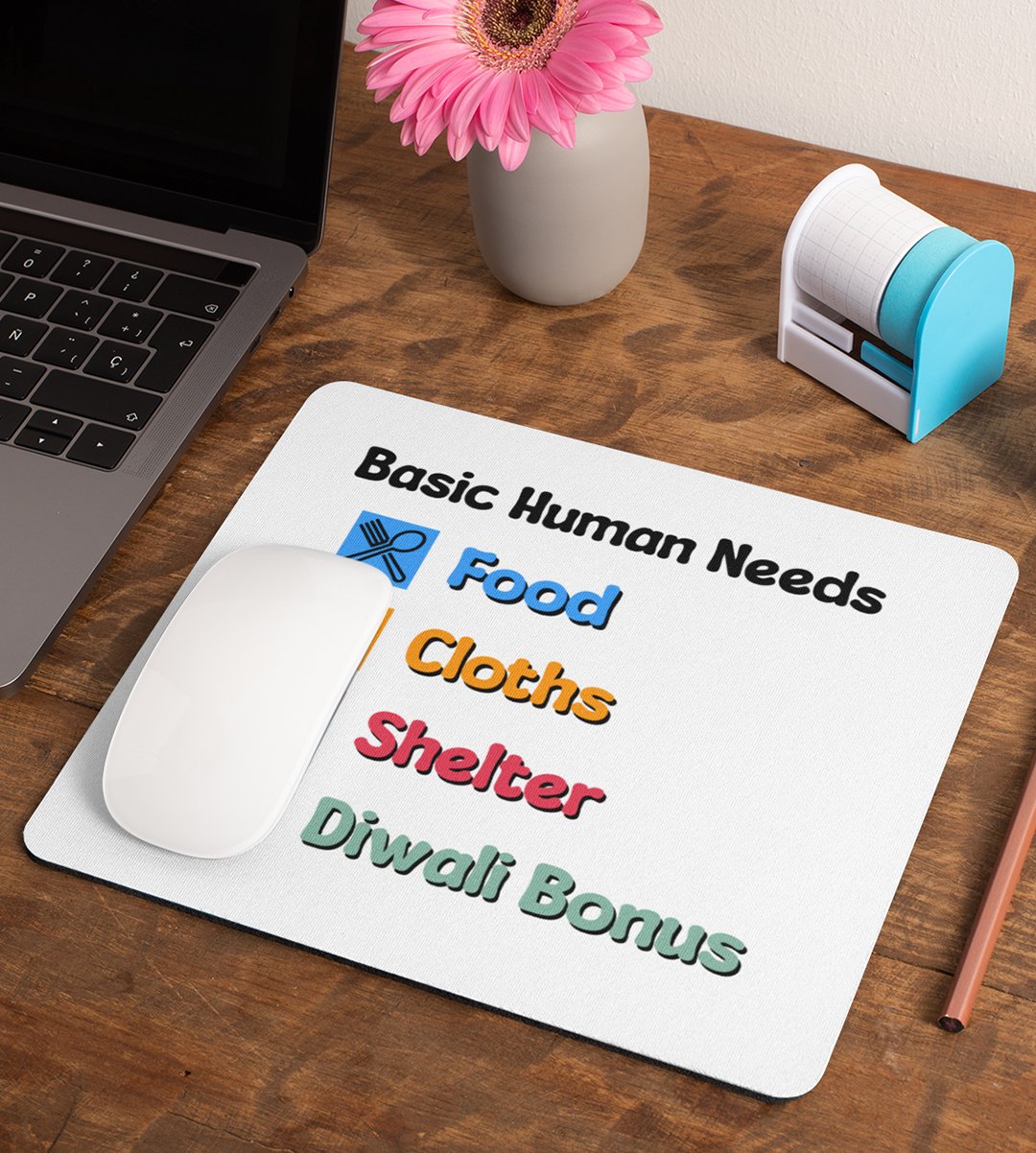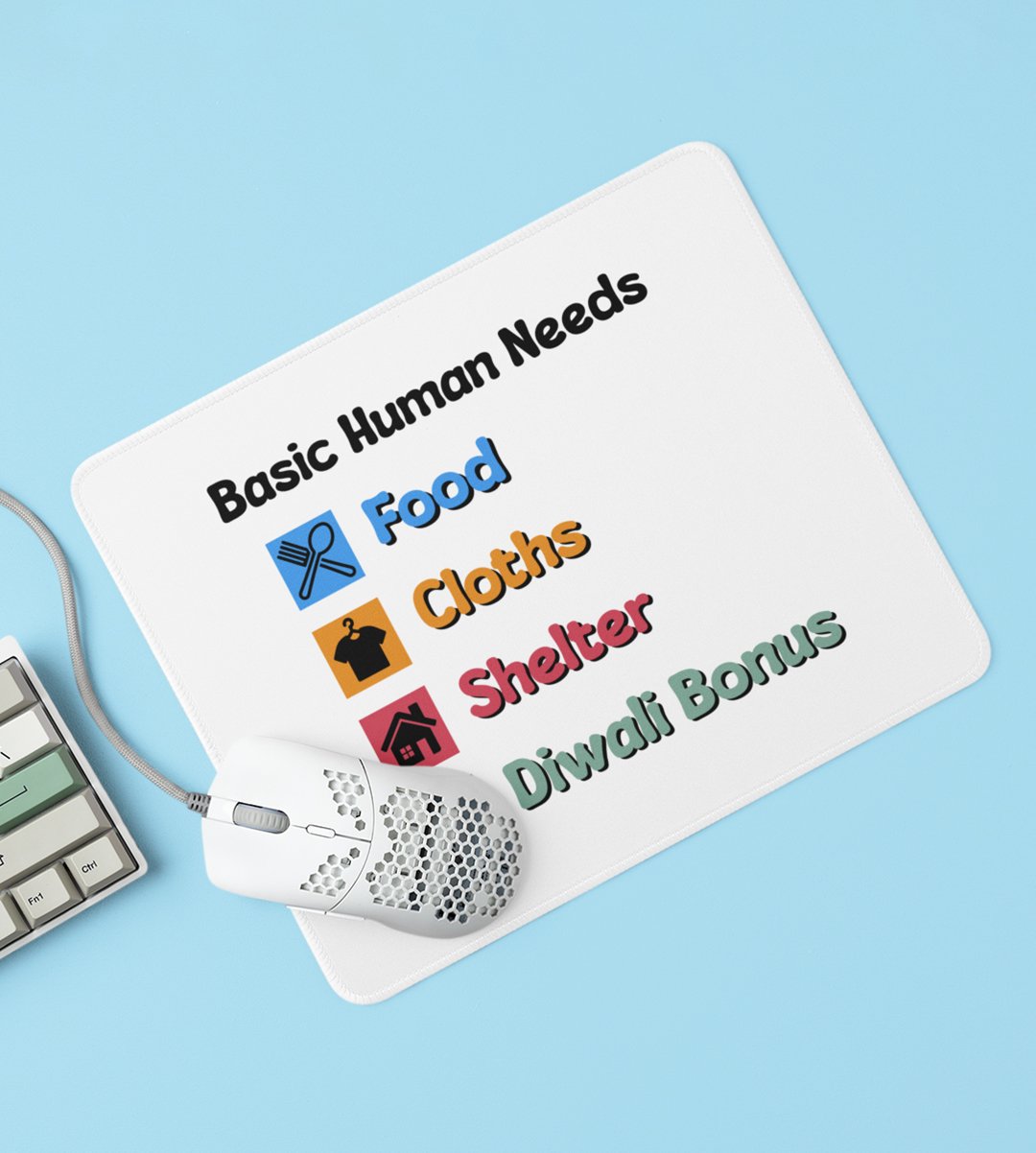 Remind yourself of the essentials, including that coveted Diwali bonus, with our Diwali Bonus Essentials Mouse Pad. It's a playful take on the season's expectations.