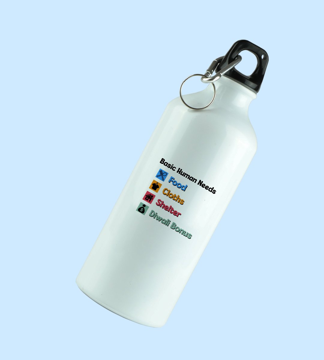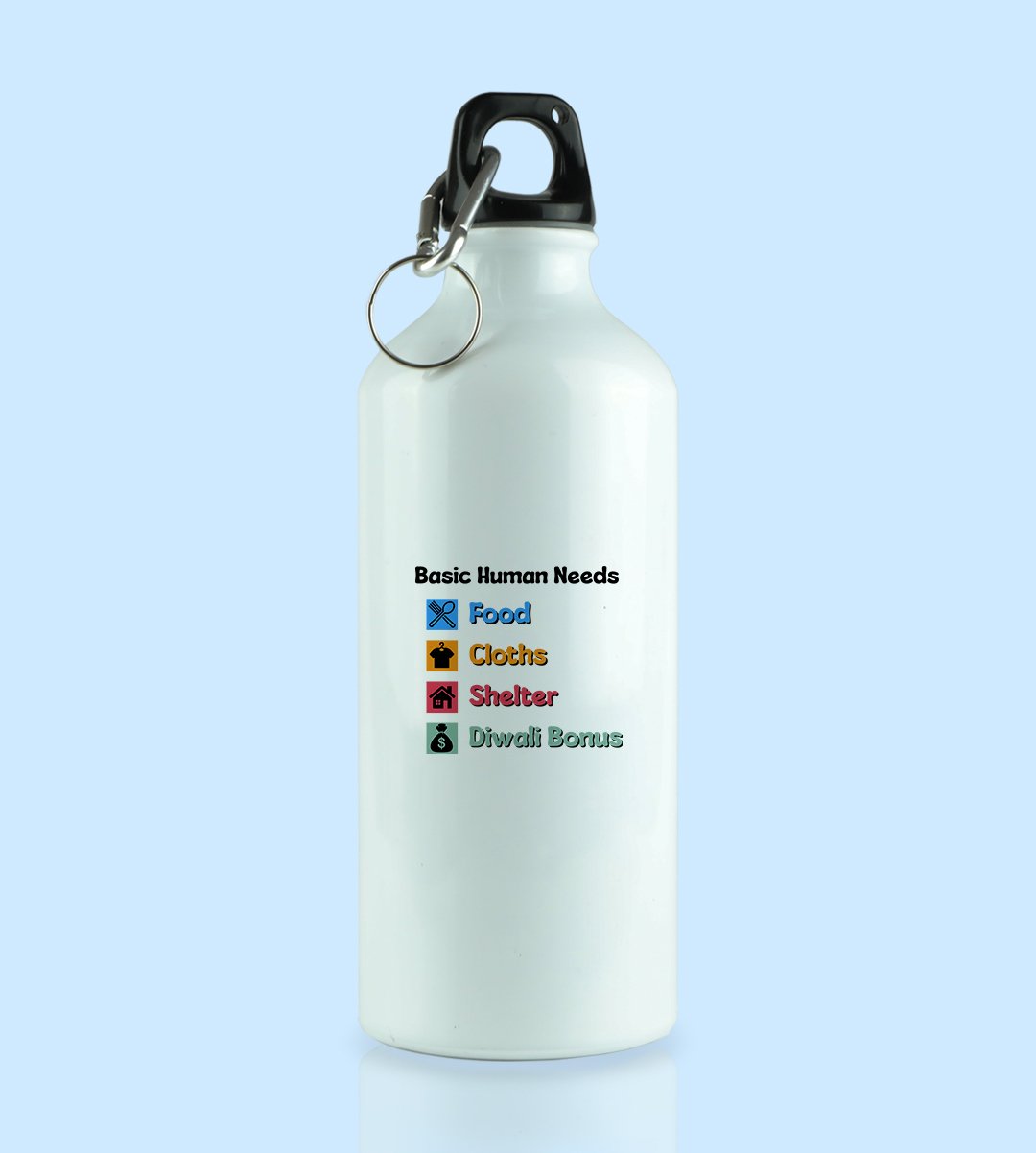 Celebrate the season of abundance with our "Diwali Bonus Delight" sipper bottle. This humorous design humorously adds "Diwali Bonus" to the list of essentials - Food, Clothes, Shelter, and Diwali Bonus. Join the laughter and revel in the anticipation of the coveted yearly tradition as every sip becomes a bonus in itself.