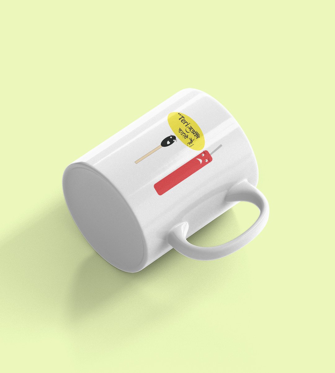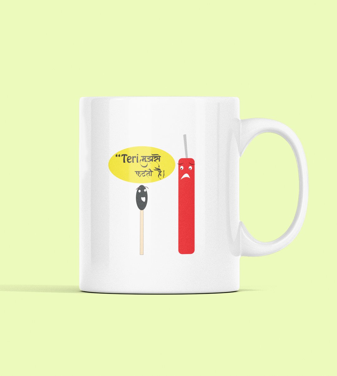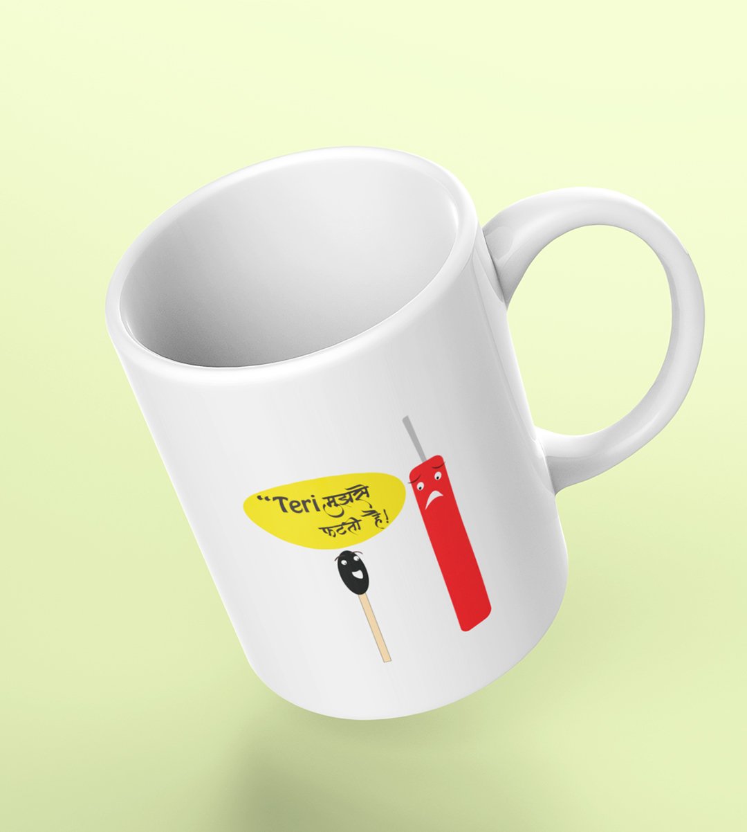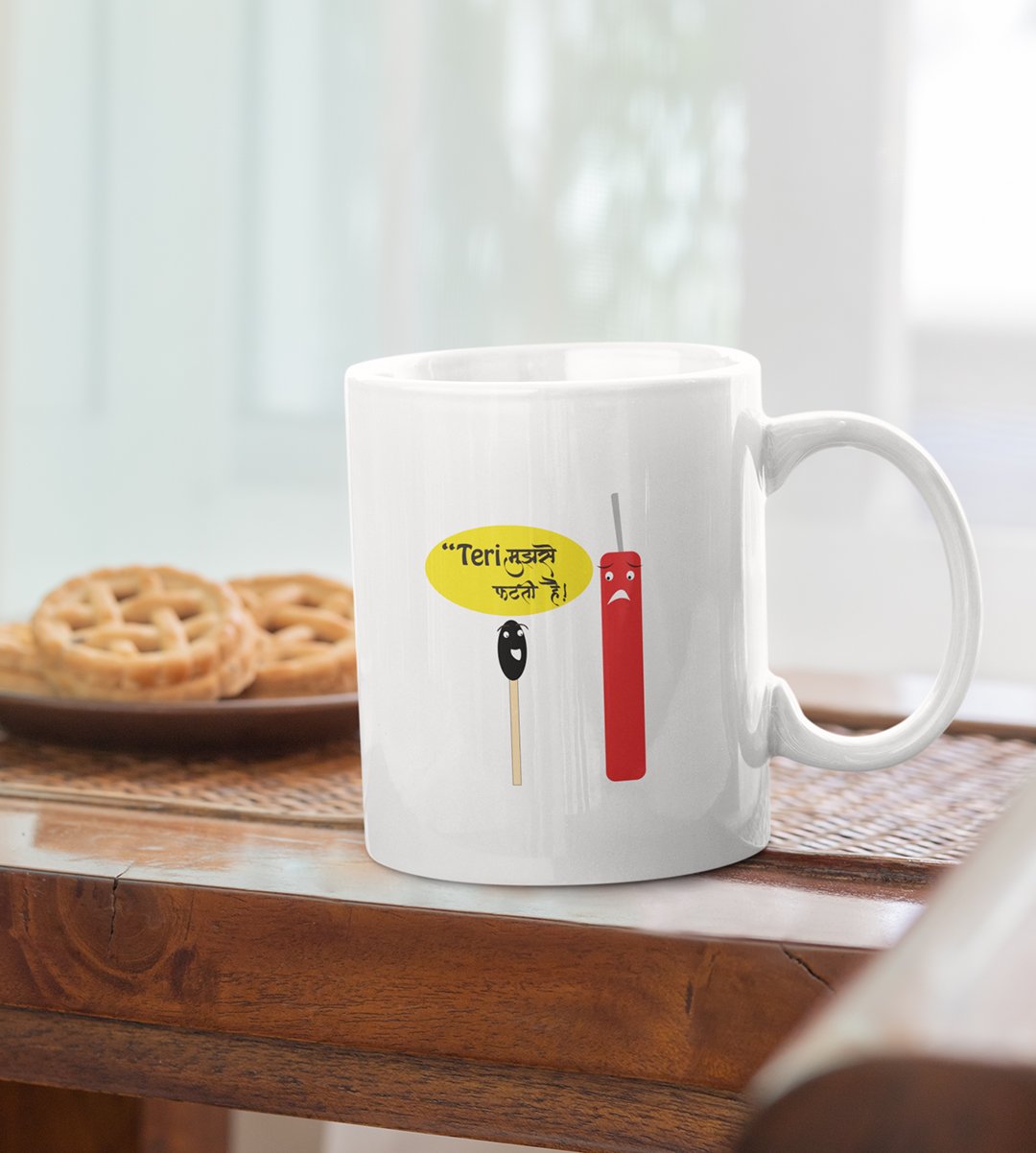 Unleash the laughter with our "Diwali Cracker Fun" Coffee Mug. This design captures the hilarious 'Teri Mujhse Fatthi Hai' moment when the Diwali cracker takes an unexpected turn. Sip your coffee and revel in the comic spirit of Diwali with this lighthearted mug.