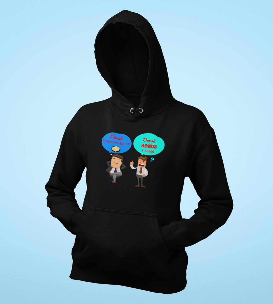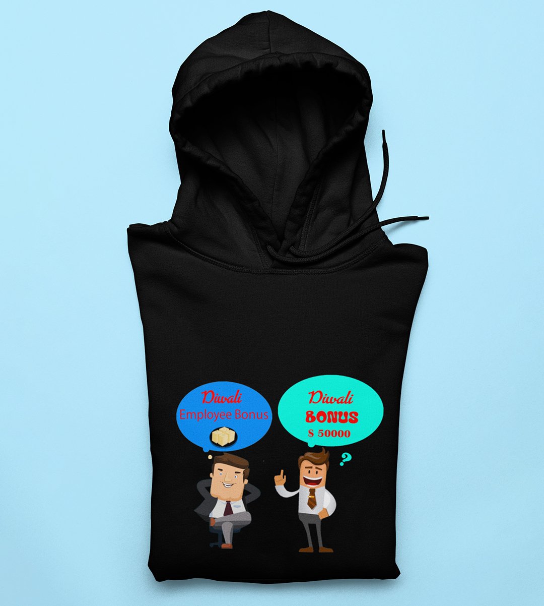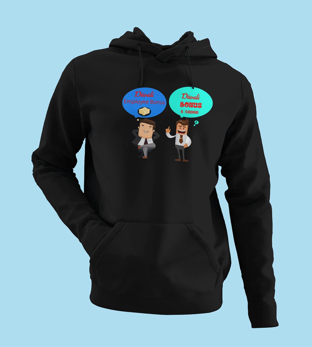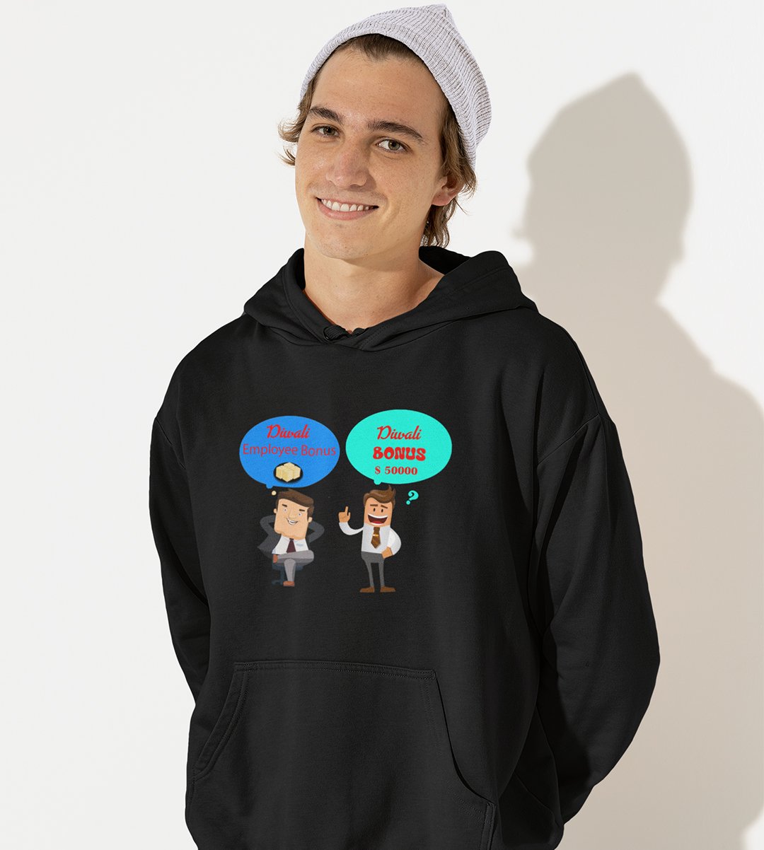 Unveil the comical side of Diwali bonuses with our "Diwali Bonus Dilemma" black Hoodie . This witty design humorously contrasts employee expectations with the boss's perspective. Whether it's dreaming of 50,000 Rs or Sonpapdi, sip your and share a laugh over the festive bonus conundrum.