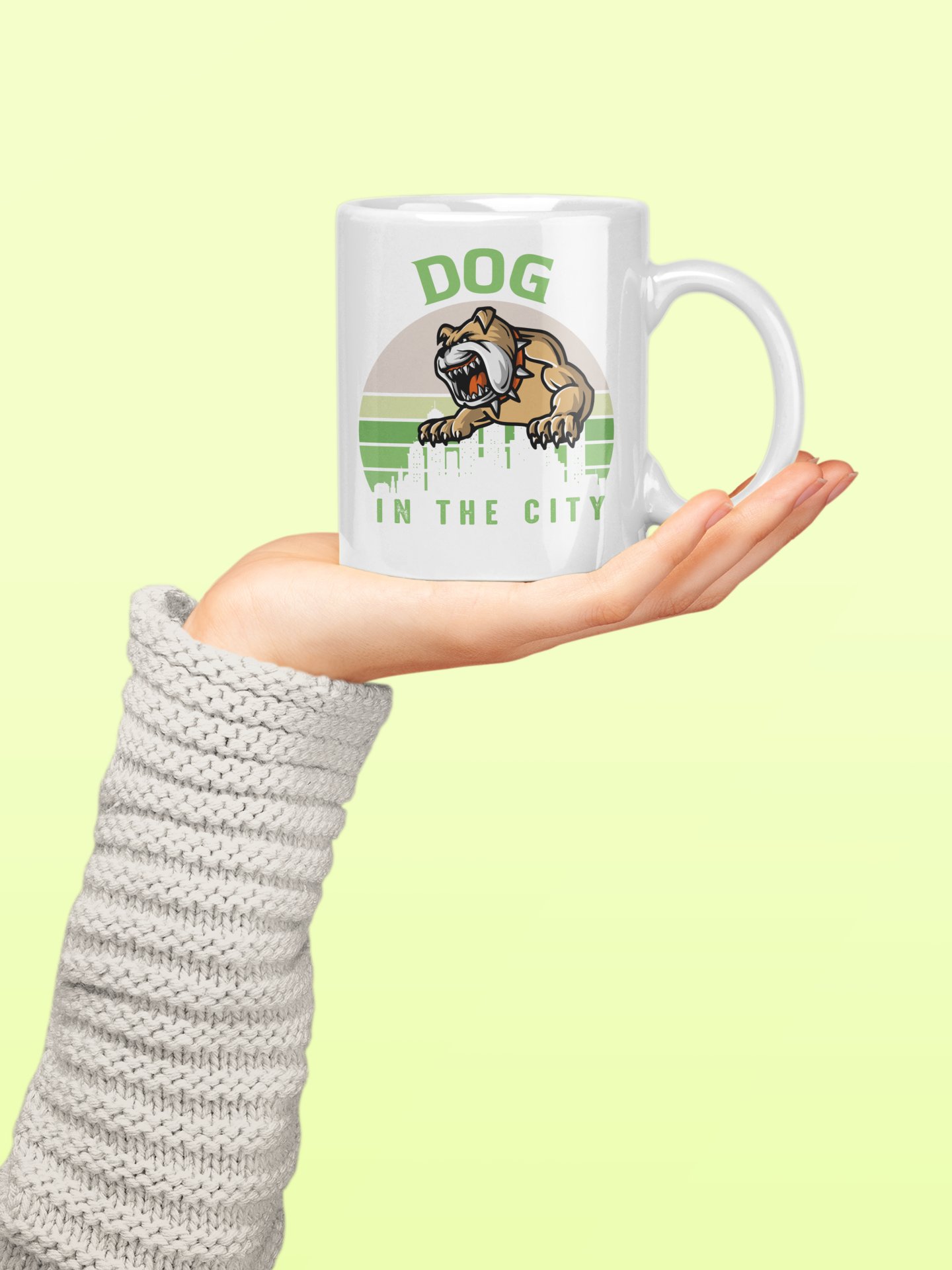 Dog in the city - pets themed printed ceramic white coffee and tea mugs/ cups for pets lover people