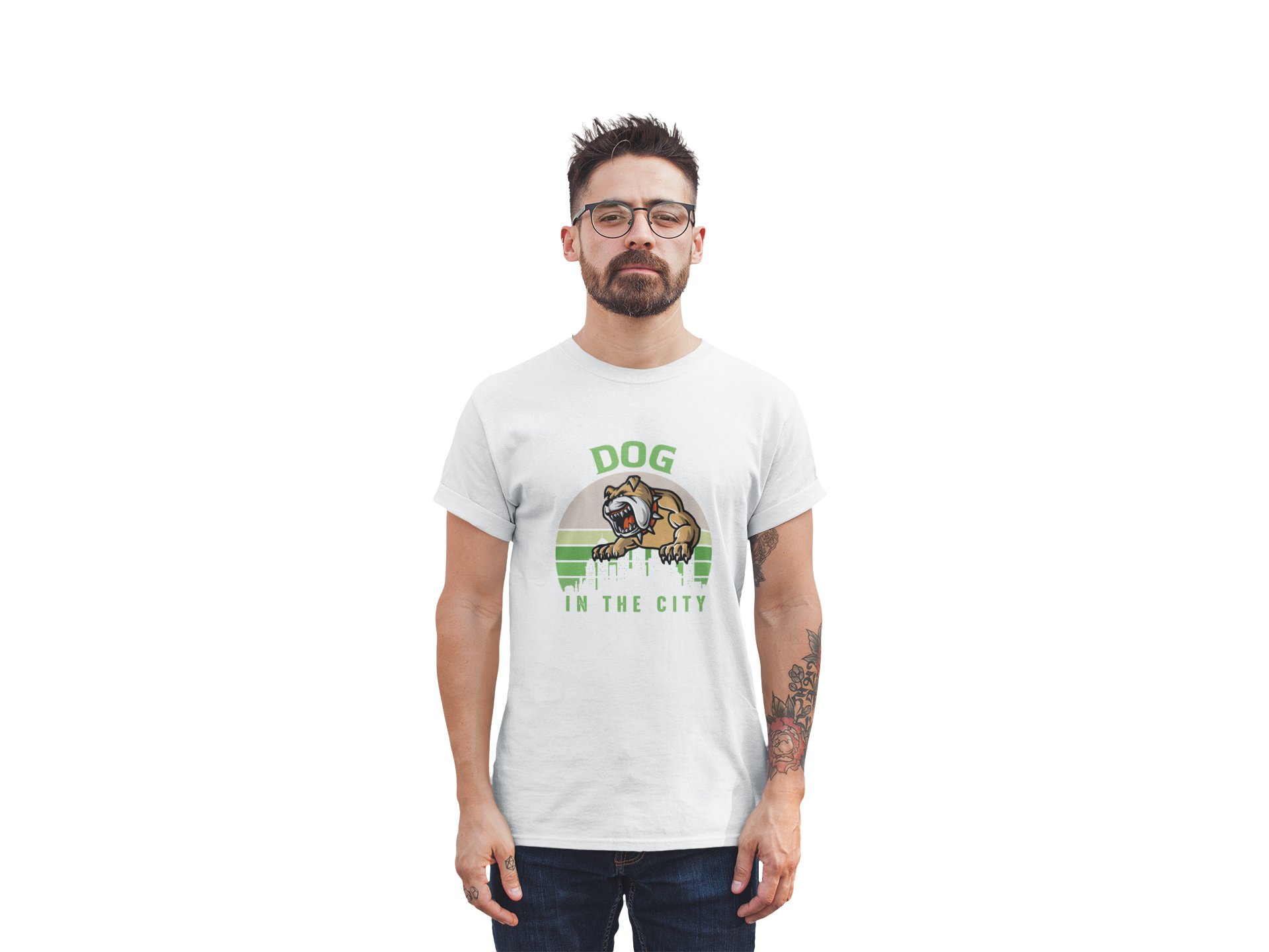 Dog in the city - printed stylish White cotton tshirt- tshirts for men