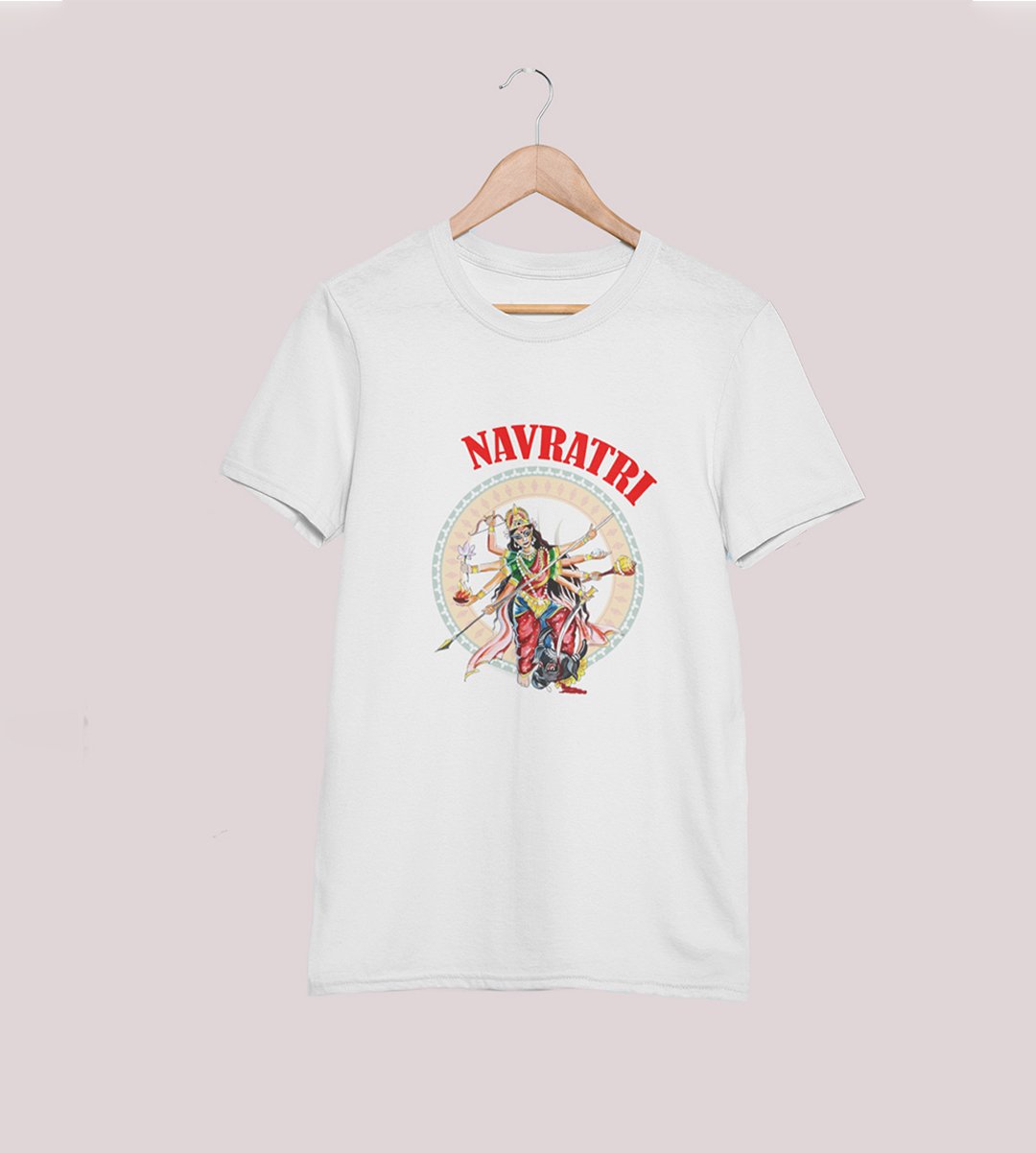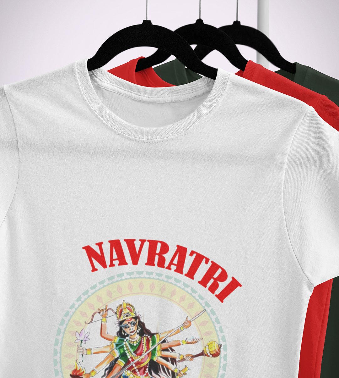 Navratri is a very auspicious festival for hindus. It takes place at the beginning of October and sometimes September. Enjoy the 9 days of festivities with full zeal and make yourself submerged in the love of Maa Durga. Navratri is also known as Durga Puja. And with this Tees, you can shine like a star during this festive season with our navratri themed cotton half sleeved Tshirts. You can pair our t-shirts with trousers and denim of your choice and make it a weekday smart casual or weekend wear. This is durable. This tshirt is smooth and soft which makes you comfortable to wear during all seasons. The printing in it is durable and odourless. It has five sizes, S,M,L,XL,XXL. The Tshirt colour is intact even after repeated washes. It can be kept in your wardrobe and hangers. Please avoid washing mashine to clean this Tee, it may affect the print. Hand wash only. We have brought you many navratri related designs printed on our different colour Tshirts to choose from. Grab it now.